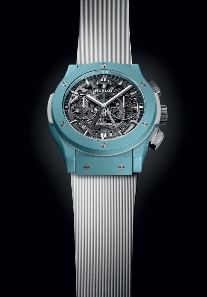Le boîtier bleu ciel de 45 mm en céramique polie et satinée est sublimé par un bracelet en caoutchouc blanc à rayures. Cette nuance turquoise, inspirée des eaux du Golfe de Naples, habille également l’aiguille des secondes, et est mise en valeur à l’intérieur du cadran squelette.