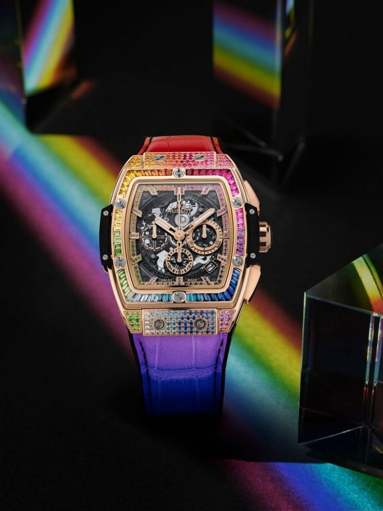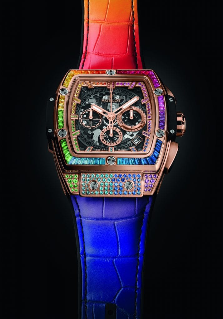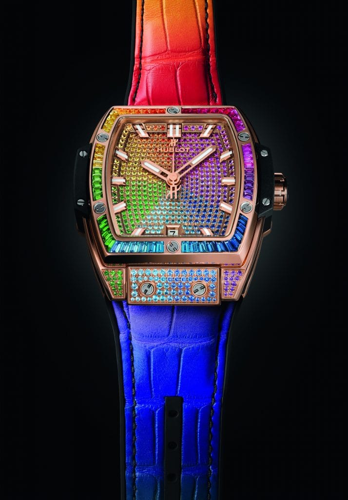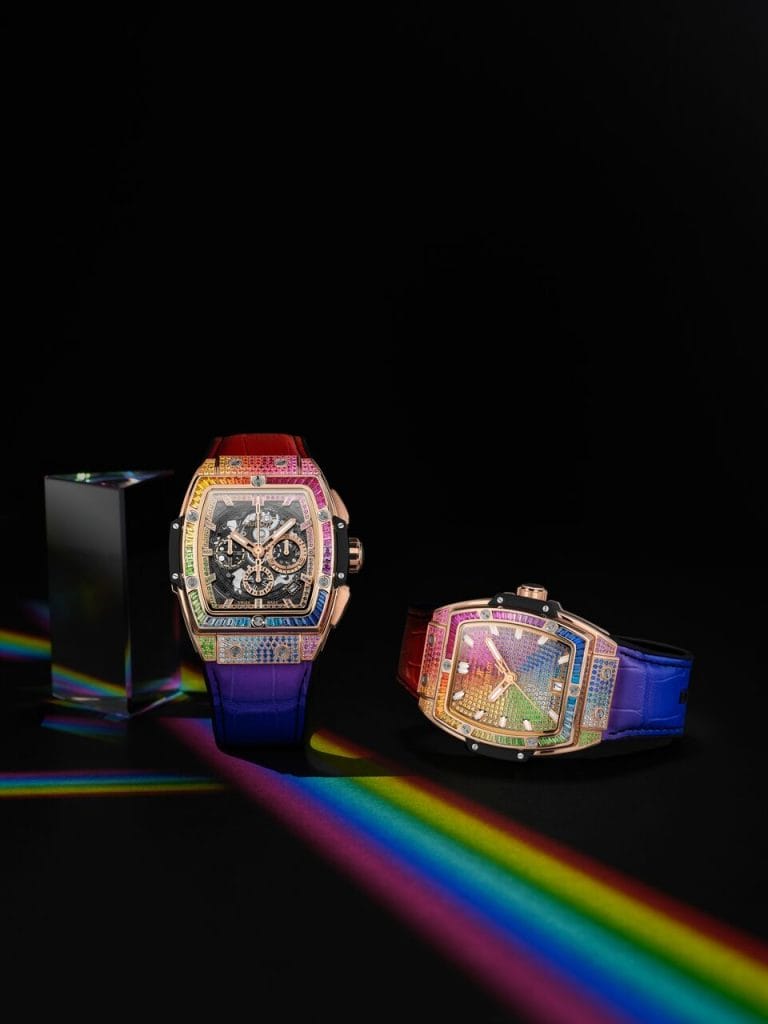 Manifestation céleste ou divine qui invite à la révérence ou à l’espoir selon les civilisations, ce pont entre ciel et terre a été décomposé par Isaac Newton dans sa théorie sur la lumière et les couleurs. Pourtant de nos jours, il demeure un symbole de paix, de joie et d’optimisme. En alchimiste moderne, maître de l’Art de la Fusion, Hublot rend immuable ce phénomène optique fugace en concevant les Spirit of Big Bang Rainbow, deux garde-temps de 39mm et 42mm, et nimbe ce début d’année 2020 d’heureux présages. Arc-en-ciel de gemmes, ils font étinceler ce spectre chromatique et font durer sa contemplation jusqu’alors éphémère.