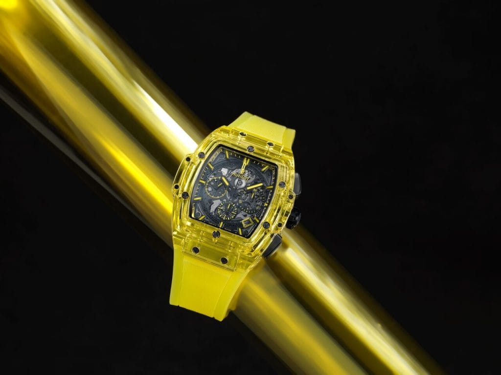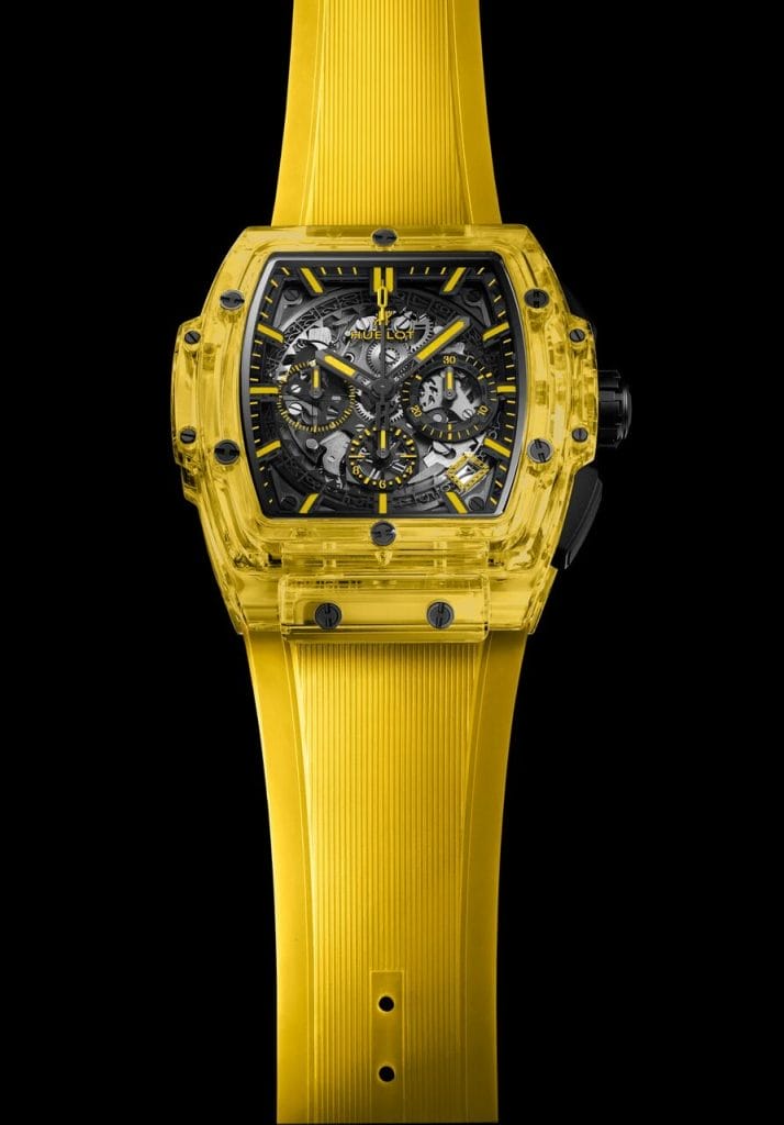Une montre aussi dure et résistante aux rayures que le diamant (9 sur l’échelle de Mohs vs 10 pour le diamant) et aussi légère que le titane, 107 grammes au poignet. Une transparence absolue habillée de l’éclat d’un jaune solaire qui se prolonge jusqu’à son bracelet en caoutchouc naturel ligné de couleur jaune.