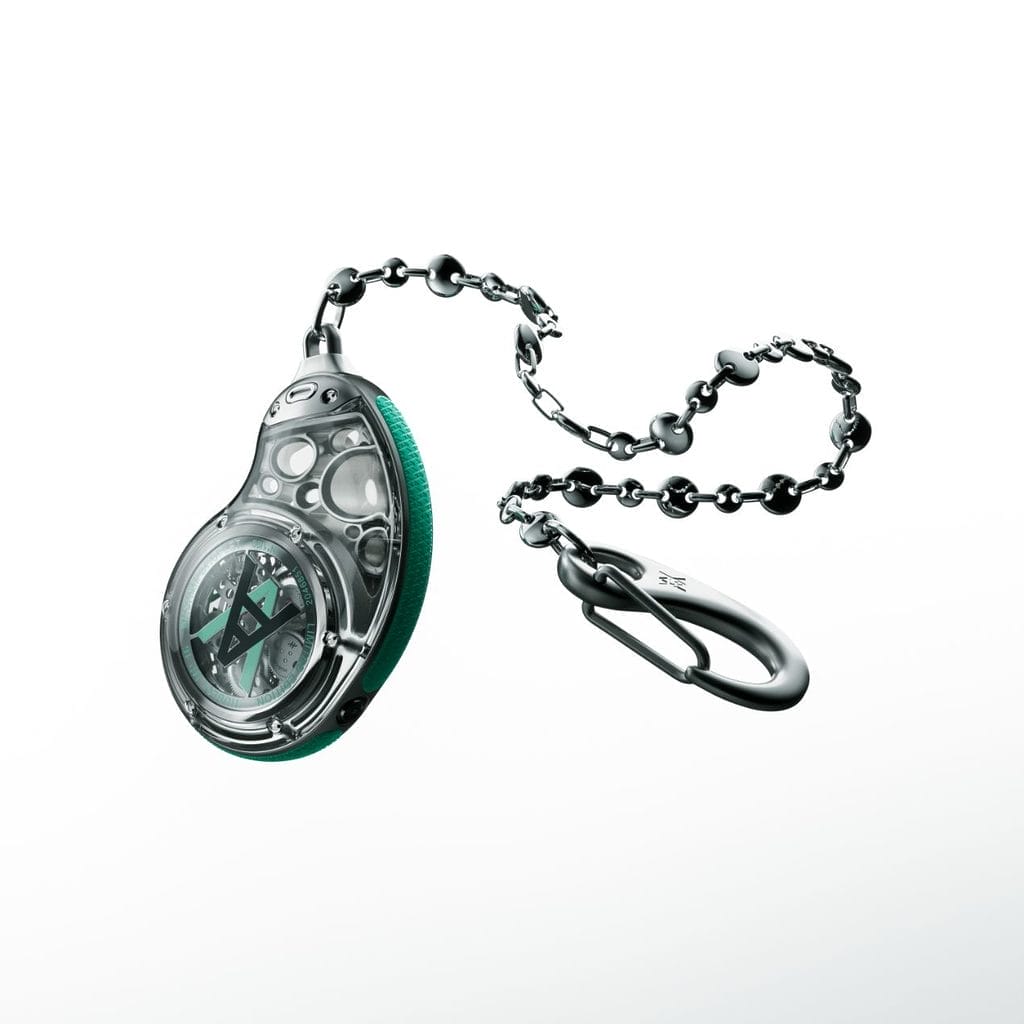 Réalisé en titane, le boîtier ajouré – tel de la fine dentelle – présente une construction en sandwich avec deux somptueuses glaces bombées, également en forme de goutte. Les protections latérales, en caoutchouc couleur Arsham Green, sont estampées du monogramme de l’artiste.