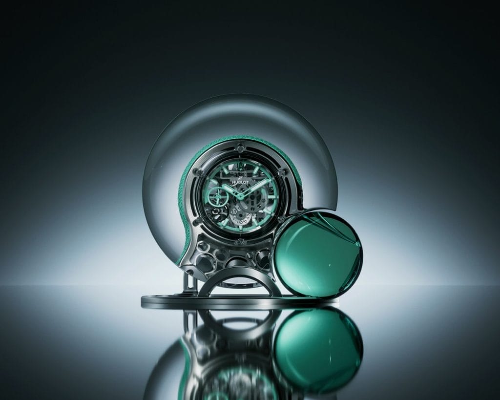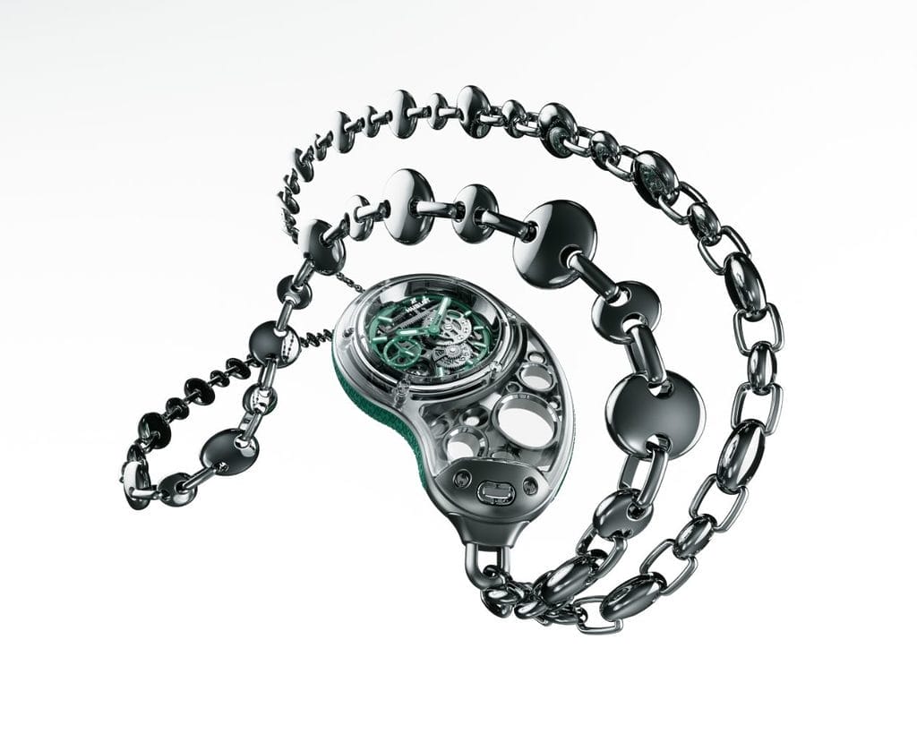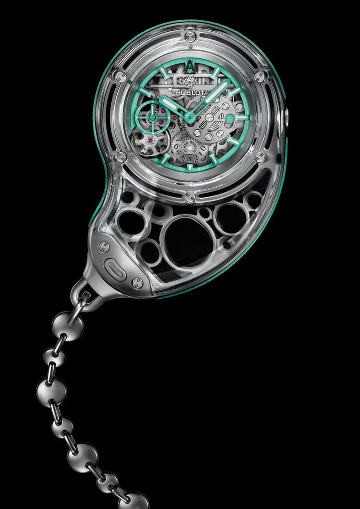 Le design organique est complété par un boîtier en titane et des protections en caoutchouc – un détachement audacieux des normes horlogères traditionnelles. Proposée avec deux chaînes en titane, chacune équipée du double système breveté One Click de Hublot pour faciliter leur fixation, la montre peut être arborée de multiples façons : collier, montre de poche ou pièce maîtresse sculpturale sur son support de table décoratif en titane et verre minéral.