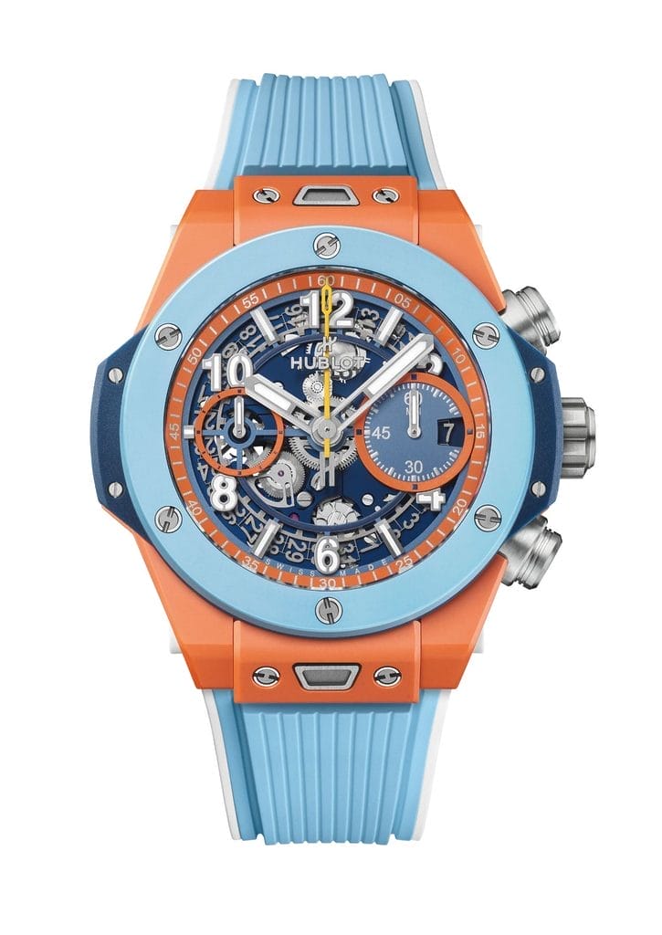 Montre dotée d’un boîtier en céramique orange microbillée et d’une lunette en céramique bleu ciel microbillée. Elle embarque le mouvement UNICO HUB1280 à remontage automatique avec fonction chronographe Flyback et roue à colonnes. Vendue avec un bracelet en caoutchouc bleu ciel et blanc, elle inclut également deux options supplémentaires : bleu foncé et blanc, ou orange et blanc. Édition limitée à 100 pièces.