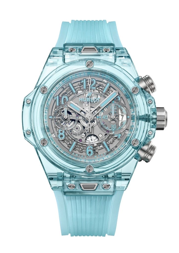 Montre réalisée en verre saphir bleu océan poli, avec lunette assortie. Elle est animée par le calibre UNICO HUB1280, un mouvement automatique avec chronographe Flyback et roue à colonnes. Bracelet en caoutchouc transparent bleu océan.