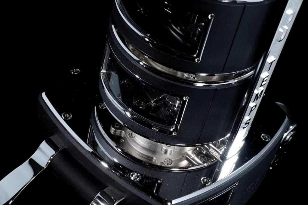 « La Colonne du Temps » présente un élégant boitier, caractérisé́ par des cornes qui maintiennent toute la colonne. Elle est majoritairement constituée d’aluminium, afin de maintenir son poids de 15kg, et arbore des finitions « noir anodisé ».