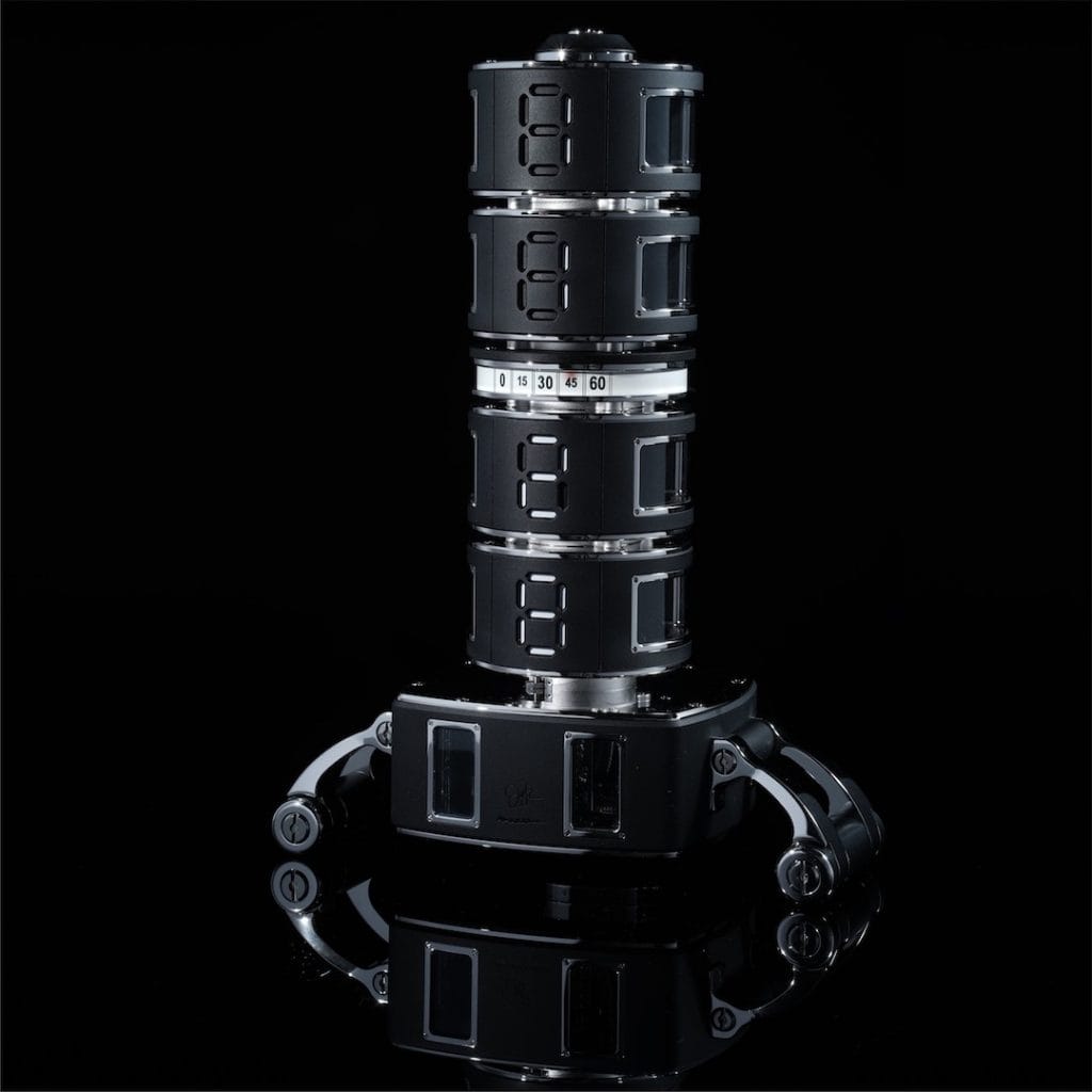 « La Colonne du Temps » est une invitation à prendre le temps de l’observer. Il s’agit de la première sculpture mécanique utilisant un système innovant d’affichage digital de l’heure en colonne. Cinq cylindres viennent s’ancrer sur un axe central vertical pour afficher le temps dans des proportions impressionnantes. Ils s’animent indépendamment, chacun à son propre rythme en fonction de sa graduation. Le designer Jorg Hysek et l’ingénieur Robert Bray ont fait appel à un jeu complexe de came et de chariots pour afficher les chiffres des heures et minutes sous forme de segments.