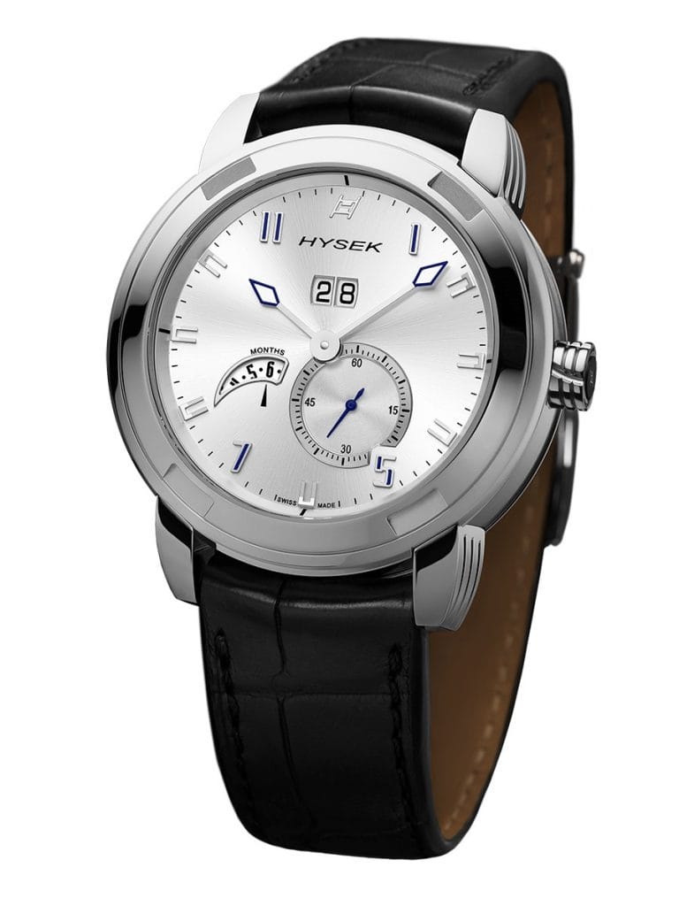 L’affichage des mois, lui, fait l’objet d’un traitement esthétique très particulier. Pour préserver la pureté et la lisibilité de sa création, la manufacture n’a pas souhaité ajouter d’aiguille centrale – un choix très répandu pour indiquer les 12 mois, lesquels viennent effectivement se caler naturellement sur les 12 index du cadran. Hysek a préféré un affichage par disque, là encore un élément mobile additionnel qui exige une parfaite gestion de l’énergie. Ses mois décomptés de 1 à 12 sont exposés dans un guichet dédié à 8h. Le mois en cours est indiqué par une flèche qui n’offre ainsi aucune erreur d’interprétation possible.