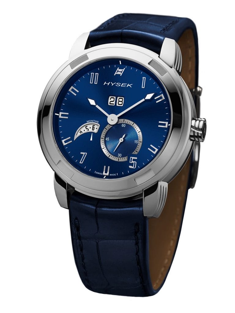 L’ensemble s’étire dans une boite de 42 mm aux cornes caractéristiques de la collection IO, marquées de trois griffes. Deux variations acier sont aujourd’hui proposées par Hysek, avec cadran gris / bracelet alligator noir ou cadran bleu / bracelet alligator bleu, toutes deux portées par une boucle déployante. Le calibre Swiss Made, fort de 193 composants, est quant à lui visible à travers un fond saphir.