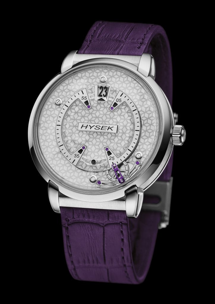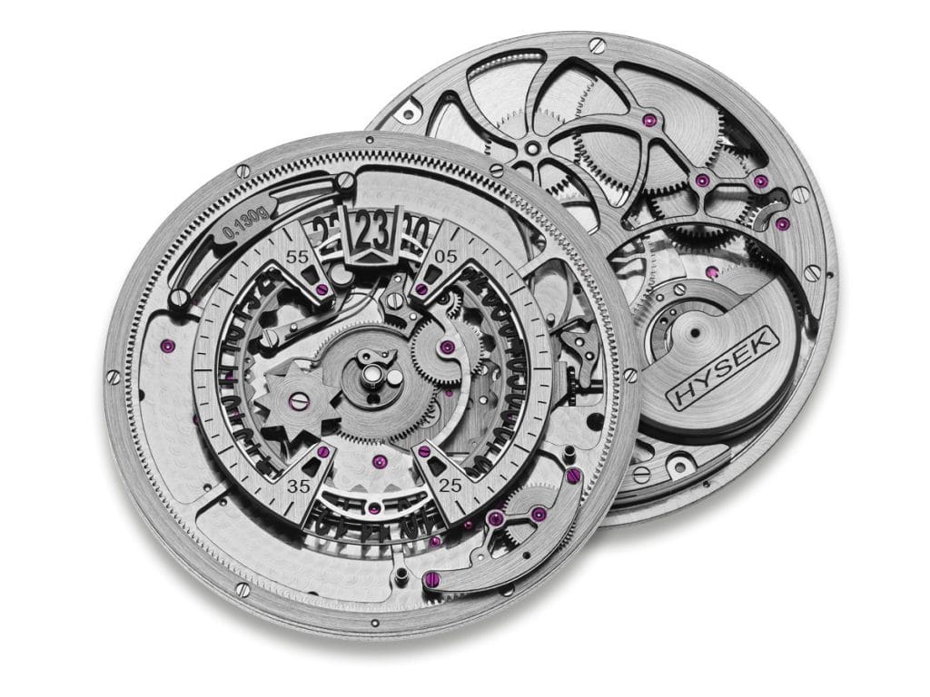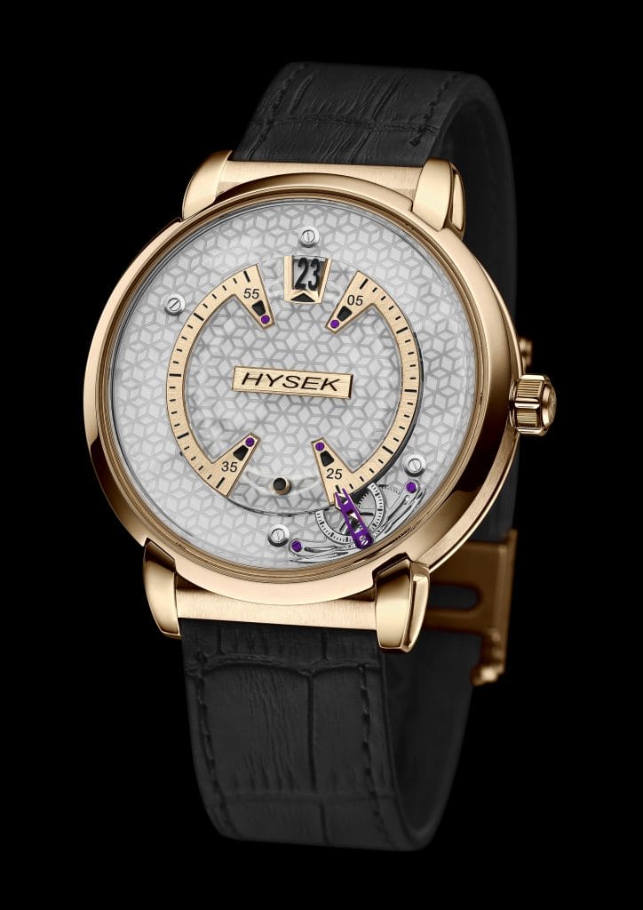 L’ensemble du dispositif est complété de 24 heures sautantes placées à midi, une autre spécialité Hysek. Le guichet qui les dévoile comporte une surface recouverte de Super-LumiNova, rendant la lecture des heures squelettées plus intuitive en tout moment du jour et de la nuit.