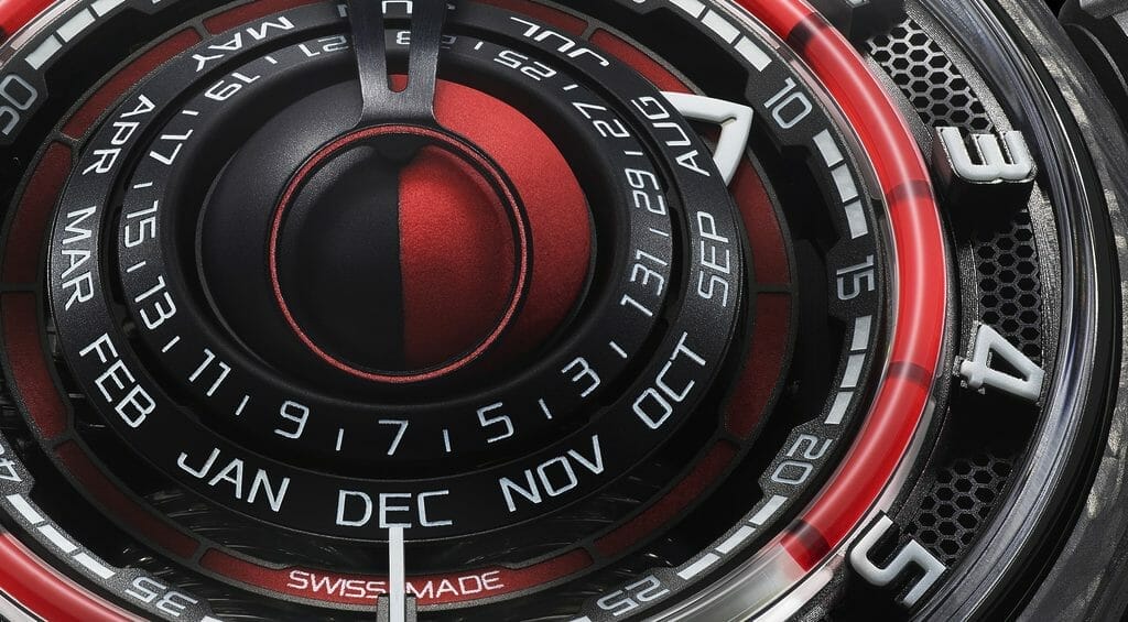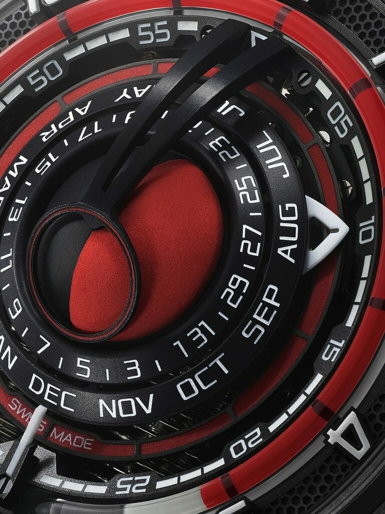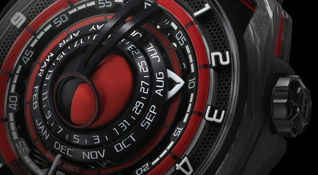 Au cœur du boîtier de 48 mm de diamètre et de 52,3 mm de longueur dont l’épaisseur est de 21,8 mm, réalisé en Hydro-carbone et en titane, partiellement habillé de rouge, surmonté d’un verre dôme en cristal saphir traité anti-reflets, le cadran noir et rouge, aux index 3D appliqués et aux chiffres luminescents blancs, dévoile clairement ses intentions et donne une place centrale et de grande dimension à la représentation de l’astre lunaire.