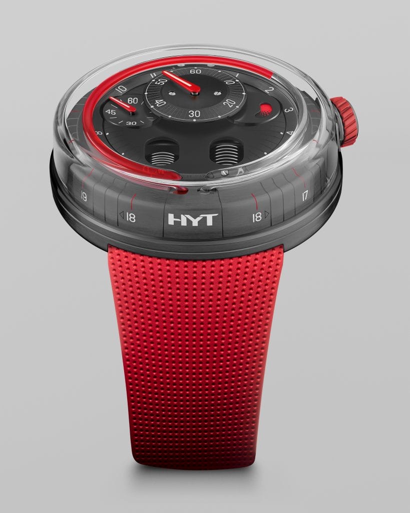 Sur la planète terre, toute vie dépend des fluides. Ce fait scientifiquement prouvé se confirme au cœur de la montre H0 X Eau Rouge de HYT. La couleur rouge de cette montre high-tech évoque l’essence même de la vie avec ses trois fonctions primaires : transporter, protéger et réguler. La montre H0 X Eau Rouge offre une représentation en direct du temps qui s’écoule, grâce à un liquide rouge et un transparent non miscible qui symbolisent les deux principales sources de la vie. Un module micro-fluidique breveté se partage la vedette avec un calibre mécanique exclusif afin de refléter l’écoulement inéluctable du temps, la source vitale de la Marque.