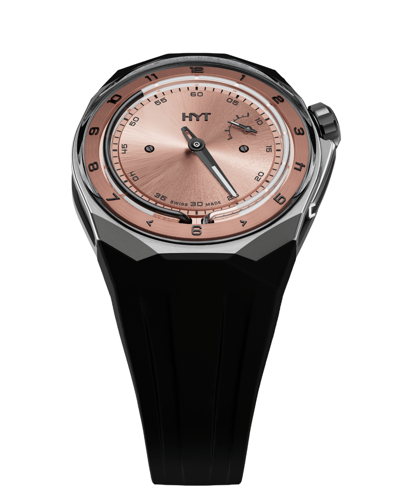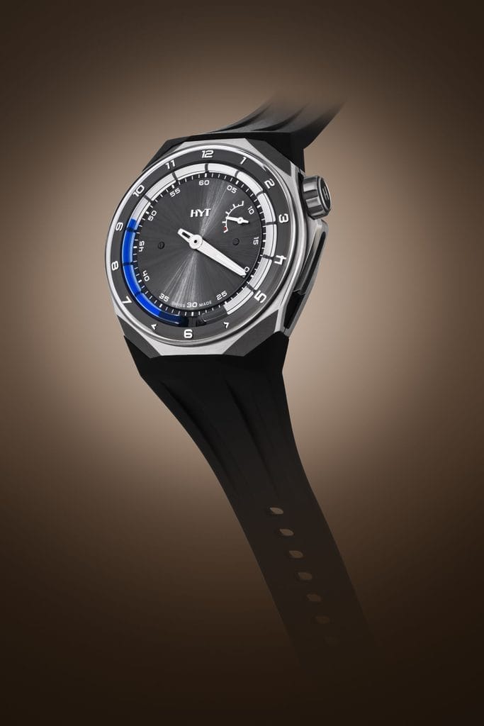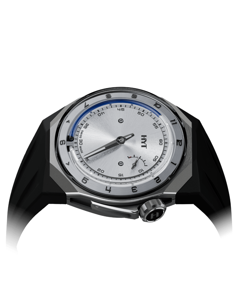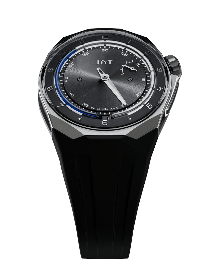 Les montres HYT réunissent science, technologie, haute horlogerie et design. Inspiré par le fonctionnement des clepsydres des pharaons, deux réservoirs flexibles, situés à 6 heures, sont soudés à chaque extrémité d’un capillaire. Dans l’un, un liquide aqueux coloré. Dans l’autre, un liquide transparent visqueux. Pour les maintenir séparés : la force de répulsion des molécules de chaque fluide. Délimitant la frontière entre les deux : le ménisque.