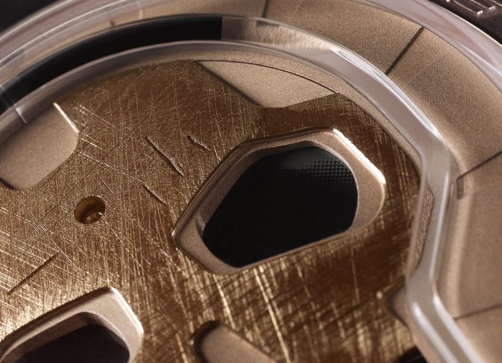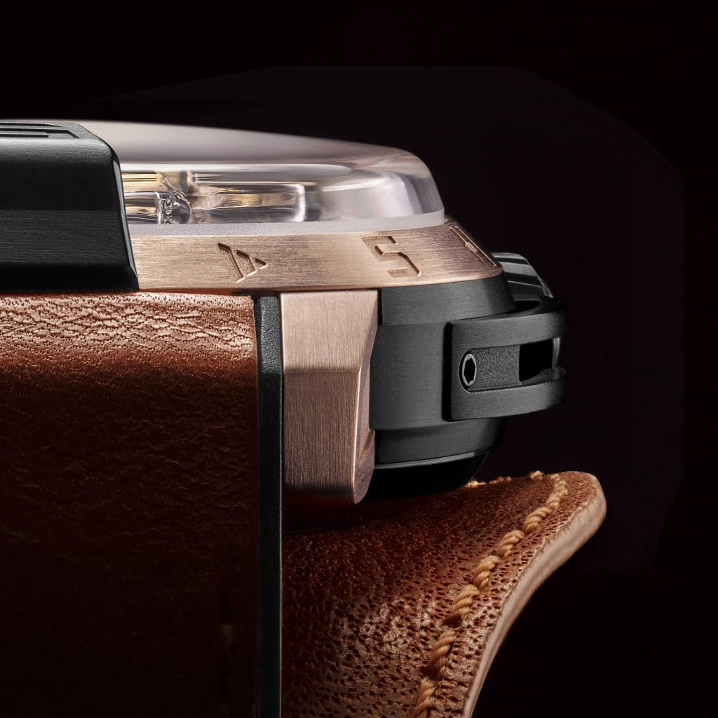 La boîte de la première Skull 48.8 est en or rose 5N. Les heures sont indiquées sur la lunette extérieure. Traité par microbillage, le cadran extérieur offre un magnifique effet grainé. Le bracelet est en alligator noir mat. La seconde Skull 48.8, en or rose (5N) et titane noir DLC, présente un cadran extérieur traité d’une couche galvanique grise anthracite. Le bracelet en cuir patiné couleur cognac, avec âme caoutchouc, est muni d’une manchette assortie.