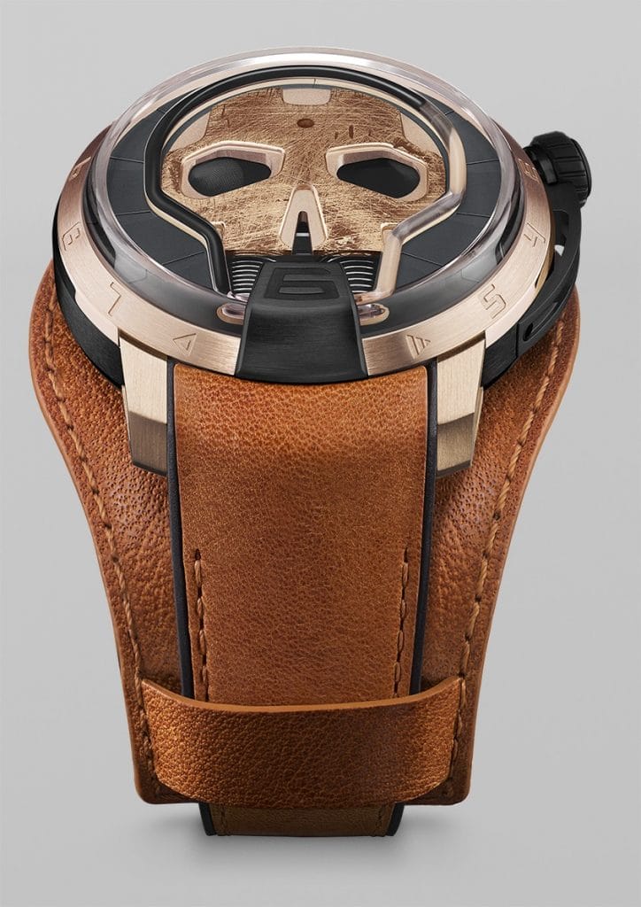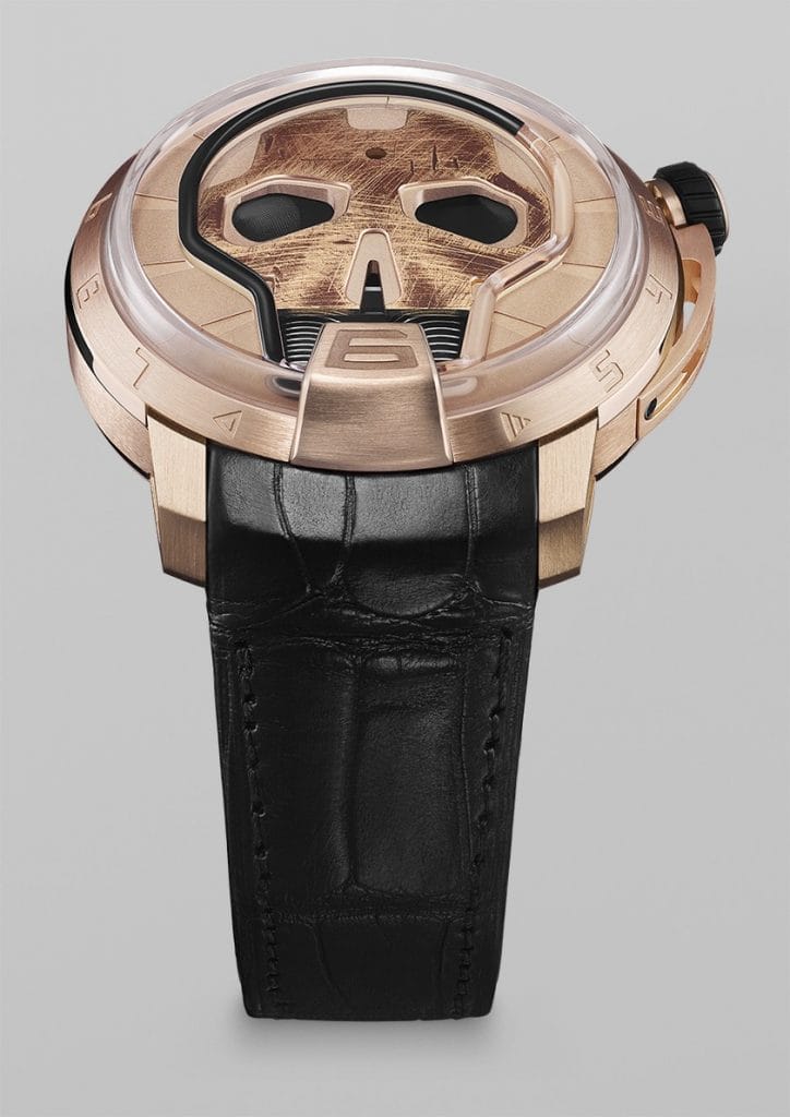 Aujourd’hui, un nouveau modèle vient compléter la collection : la Skull 48.8. Le boîtier est passé de 51 mm à 48.8 mm pour convenir aux poignets plus fins. Le crâne est patiné. Le mot sonne comme un enrichissement, une couche supplémentaire de vécu. Cette patine est solidaire du temps qui passe grâce au dispositif HYT. Plus précisément grâce au capillaire qui épouse la forme du crâne, un exploit d’ingénierie du verre.