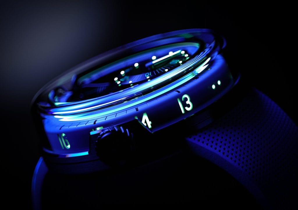 À une époque où les agendas ont tendance à déborder, la dernière-née H0 aspire à donner du sens au temps. Cette fonctionnalité pertinente repose sur une esthétique avant-gardiste – avec une forme évoquant un galet poli –, un cadran bombé ainsi que le module fluidique breveté HYT. Le pourtour de la boîte arbore des chiffres imposants qui marquent le défilement des heures et brillent dans l’obscurité. Ces détails reflètent l’engagement de la H0 en matière de tri-dimensionnalité : après tout, depuis quand le temps et l’espace se satisfont-ils de deux dimensions ou d’une seule perspective ? Les guichets en verre saphir gris fumé qui surplombent les soufflets – le centre névralgique du temps liquide – apportent une dimension visuelle supplémentaire.