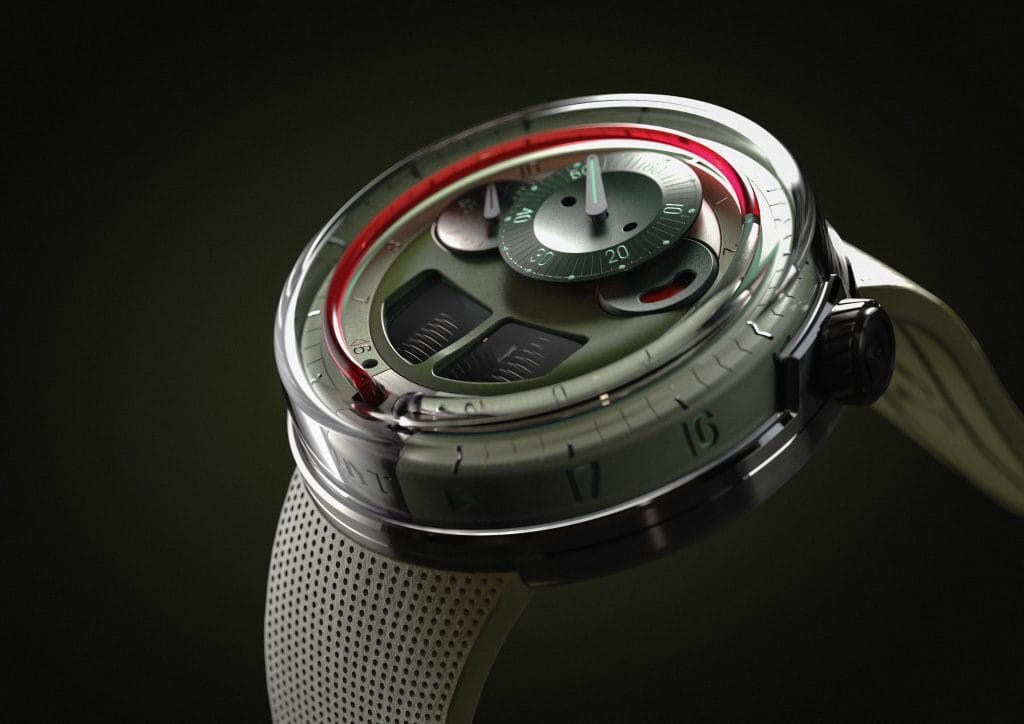 La mainmise de la nouvelle H0 sur l’éphémère et la transparence se décline en deux variantes. Sur l’une d’elles, un cadran et un bracelet en caoutchouc kaki jouent la carte du camouflage avec le revêtement DLC anthracite de la boîte en acier inoxydable. Des notes rouges et vert clair complètent la palette de couleurs, le rouge assurant une mission primordiale : représenter les heures récemment écoulées. La variante gris ardoise, légèrement rehaussée de bleu, se distingue par une boîte noire et quelques touches lumineuses sur le cadran, garantes de la lisibilité. Un liquide couleur ébène symbolise, sous nos yeux, la métamorphose du présent en passé.