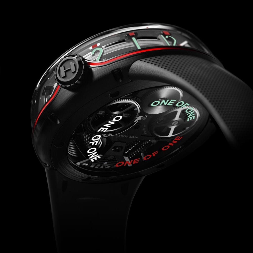 Une glace saphir en forme de cloche offre une vue latérale fascinante sur la progression du temps. Elle évoque l’équipement immaculé d’un laboratoire scientifique, voire d’une vitrine qui protégerait une œuvre d’art précieuse, ici le temps. Observés sous un angle latéral, les chiffres squelette, les repères et les indicateurs semblent flotter. Tout dans la H20 est une invitation à découvrir et explorer de nouvelles dimensions où se rencontrent le temps et l’espace dans un contexte particulier : le vôtre. Les deux soufflets accordéon inclinés forment une passerelle vers l’arrière-scène de la temporalité. Une aiguille des minutes sautante, un indicateur de position de la couronne et un indicateur thermique sont les autres acteurs de cette performance jouée en direct, dans un théâtre du temps méticuleusement organisé. La H20 trace et embrasse l’essence du flux du temps par-delà les continents.