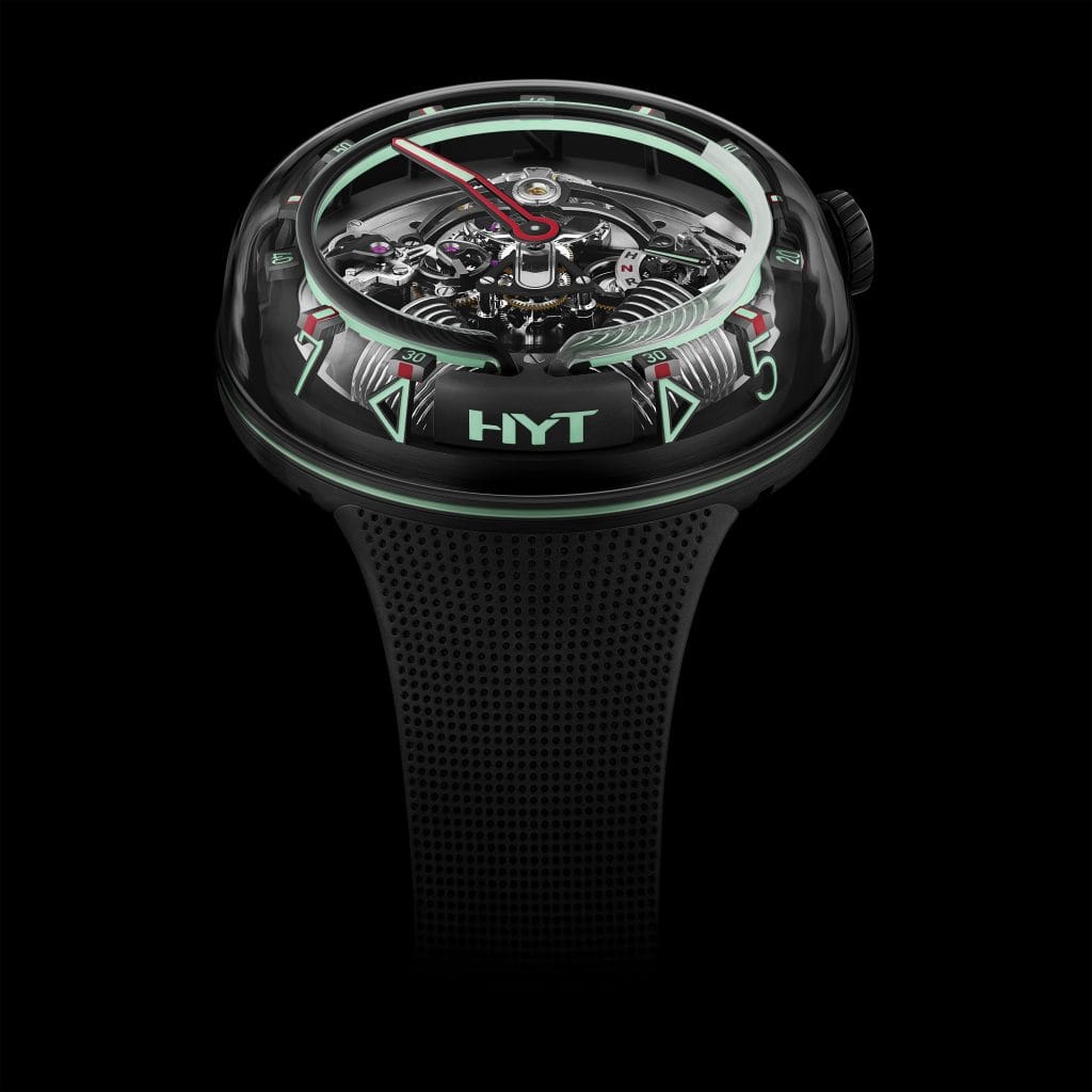 HYT est née d’une simple question : le temps s’écoule et seul son contenu lui permet de gagner en sens ; de ce fait, pourquoi limiter sa mesure à marquer le présent dans une belle cage dorée, au moyen de fines aiguilles ou de chiffres numériques fugaces ? Une équipe pluridisciplinaire, déterminée à porter et à propager ce souffle de rébellion, se constitue pour concevoir des montres qui relient de manière visible le passé, le présent et le futur. HYT propose ainsi une montre qui défie les lois de la gravité et indique le passage du temps via des éléments liquides. Inspirée de la philosophie, cette technologie de pointe reflète la fluidité intrinsèque du temps.