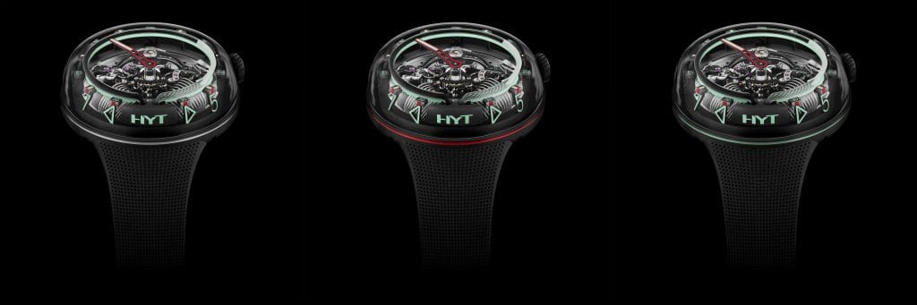 HYT est née d’une simple question : le temps s’écoule et seul son contenu lui permet de gagner en sens ; de ce fait, pourquoi limiter sa mesure à marquer le présent dans une belle cage dorée, au moyen de fines aiguilles ou de chiffres numériques fugaces ? Une équipe pluridisciplinaire, déterminée à porter et à propager ce souffle de rébellion, se constitue pour concevoir des montres qui relient de manière visible le passé, le présent et le futur. HYT propose ainsi une montre qui défie les lois de la gravité et indique le passage du temps via des éléments liquides. Inspirée de la philosophie, cette technologie de pointe reflète la fluidité intrinsèque du temps.