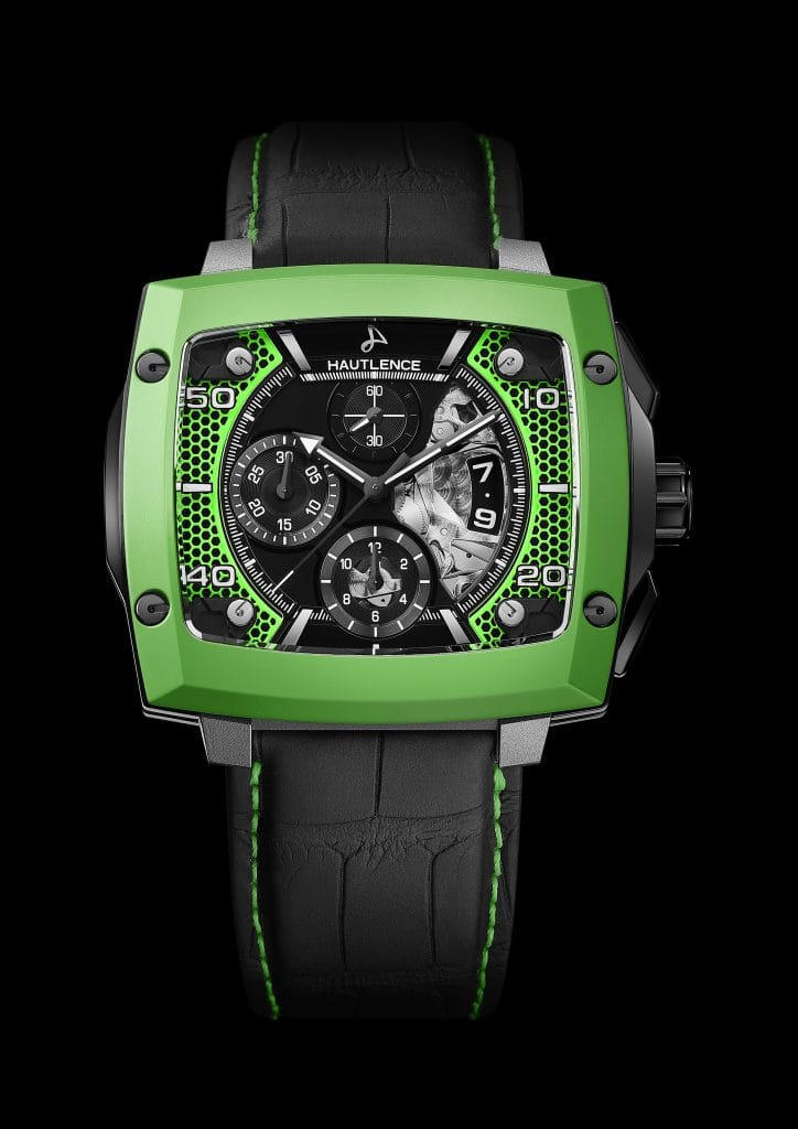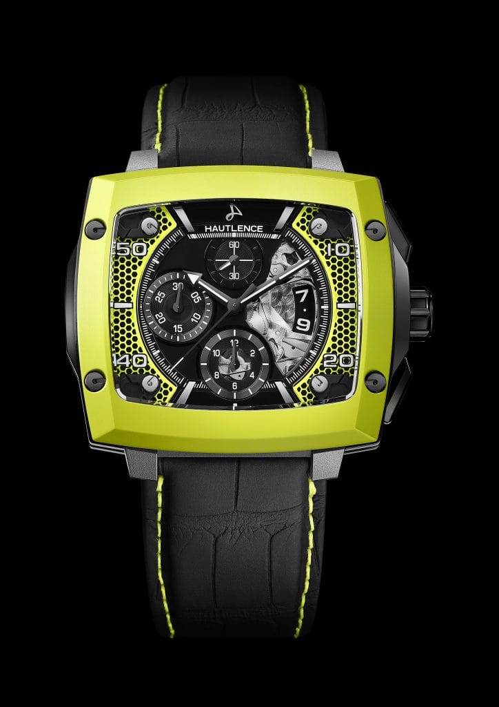 Les lignes viriles du chronographe INVICTUS sont accentuées et sublimées par les couleurs fluo, extrêmement lumineuses, dont sont intégralement recouverts les inserts au motif nid d’abeille, découpés au laser, qui ornent les côtés du cadran. Le fluo ajoute encore à la profondeur du garde-temps, renforçant l’effet tridimensionnel obtenu par les deux cadrans superposés. Ce jeu sur plusieurs niveaux est l’une des caractéristiques de HAUTLENCE, qui aime doter ses créations d’un cadran opalin de base, associé à un cadran intermédiaire en saphir sur lequel semblent flotter les chiffres des heures, décalqués et recouvert de Super-Luminova® blanche. Répondant à la couleur du motif nid d’abeilles, une lunette colorée vient parachever le tout.