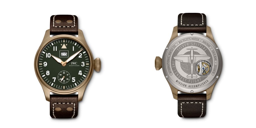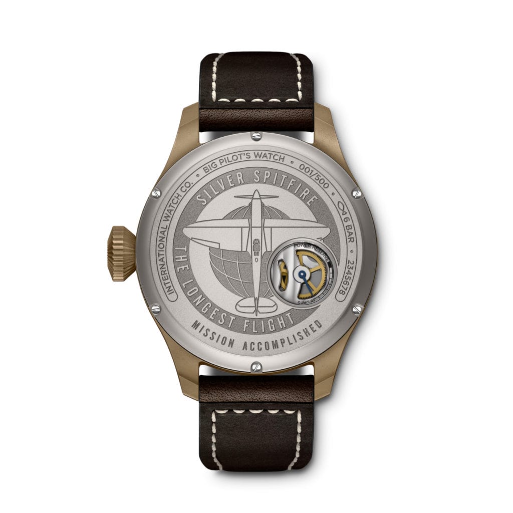 La Grande Montre d’Aviateur Grande Date Spitfire Édition « Mission Accomplished » (réf. IW510506) est limitée à 500 exemplaires. Une gravure unique sur le fond du boîtier commémore le succès de l’expédition « Silver Spitfire – The Longest Flight » auquel IWC a contribué en tant que principal sponsor et « Chronométreur Officiel ».