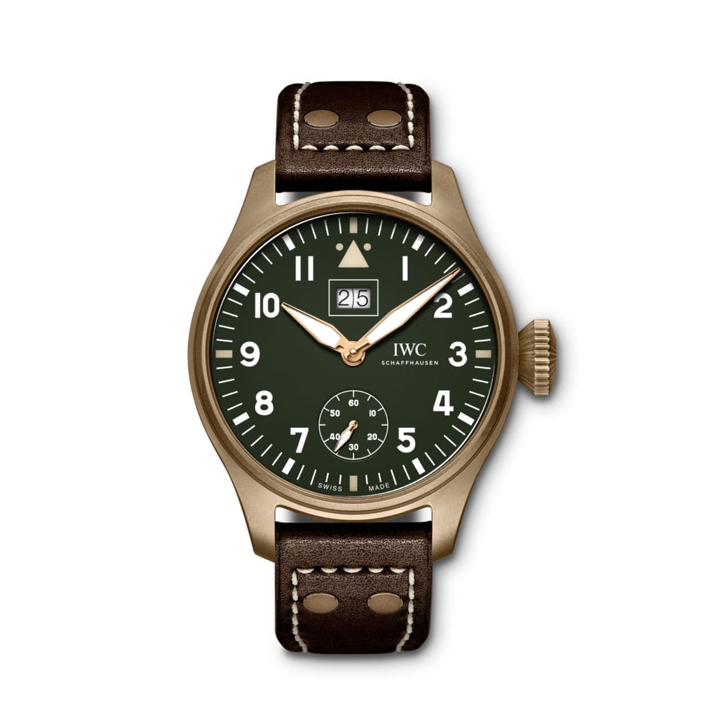 Cette nouvelle Grande Montre d’Aviateur de la ligne Spitfire arbore un cadran vert et un boîtier en bronze, matériau qui développe une patine unique au fil du temps. La date aux chiffres généreux est représentée à 12 heures par un double anneau – un pour les dizaines et un second pour les unités.