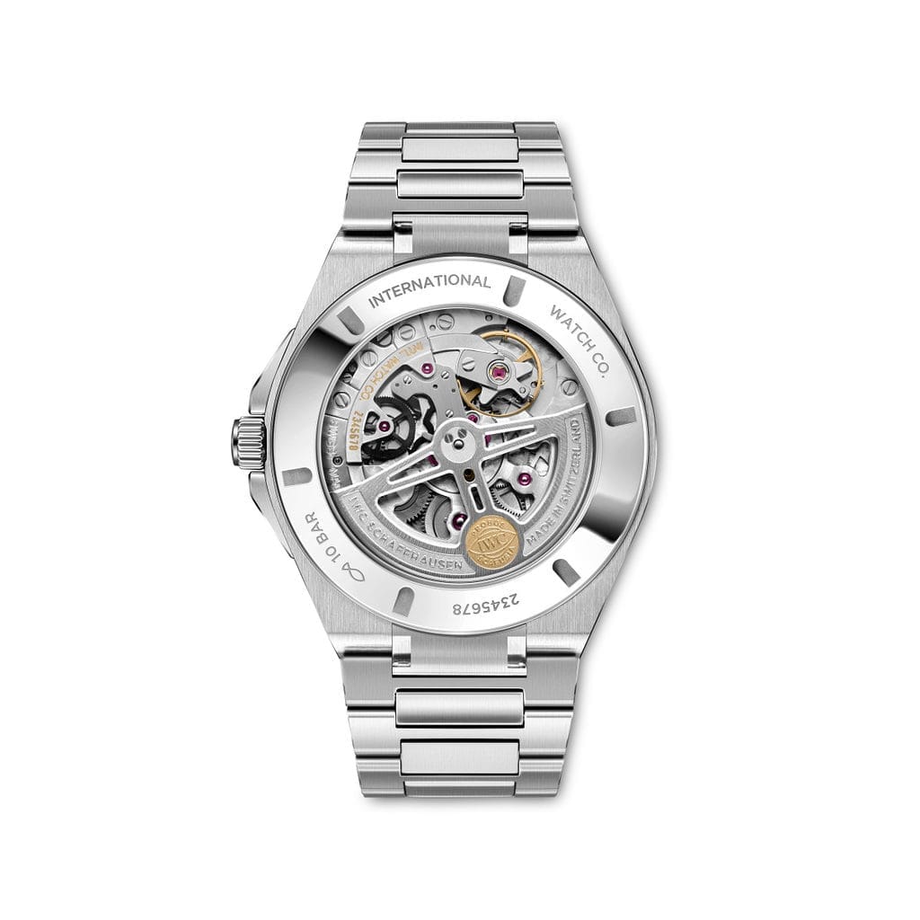 Le cadran bleu arbore le motif quadrillé caractéristique de la collection et intègre trois guichets indiquant la date, le jour de la semaine, le mois et les phases de lune. Les aiguilles rhodiées et les index métalliques sont recouverts de matière luminescente afin d’assurer une excellente lisibilité en toutes circonstances. Visible à travers un fond en verre saphir, le calibre 82600 de manufacture IWC est équipé du système de remontage automatique Pellaton, utilisant des composants en céramique ultra résistants.