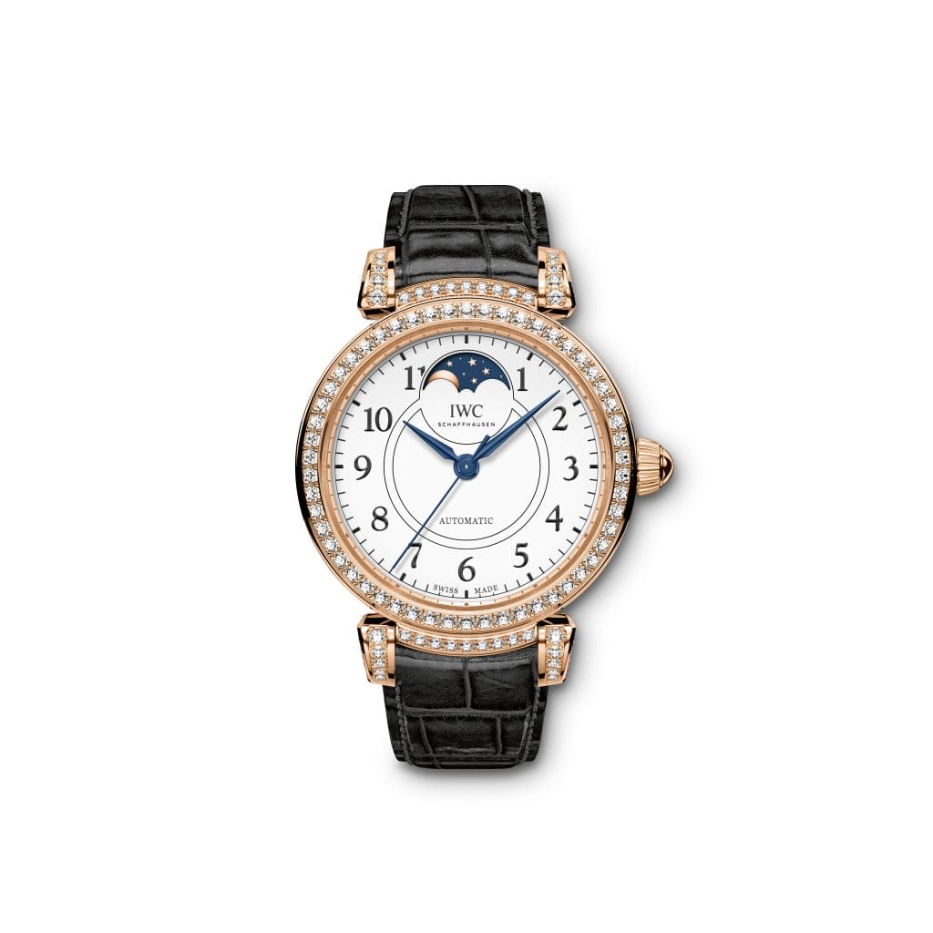Avec ce garde-temps élégant, IWC renoue avec la tradition des montres-bijoux richement ornées qu’elle entretenait déjà fin des années 1980 et dans les années 1990 avec des modèles comme la Lady Da Vinci en or jaune, sertie de diamants, référence IW8435. La Da Vinci Automatic Phase de Lune 36 Edition « 150 Years » (réf. IW459304) est composée d’un boîtier en or rouge 18 carats, d’un cadran blanc en finition laquée et d’aiguilles bleuies. Cette édition est limitée à cinquante exemplaires. La montre dispose d’un affichage des phases de lune à « 12 heures ». Le boîtier et les cornes de bracelet mobiles sont entièrement sertis de 206 diamants d’un blanc pur pour un poids total de 2,26 carats.