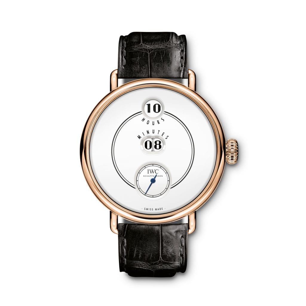 chiffres imprimés sur des disques rotatifs. Dès 1884, la manufacture avait utilisé ce type d’affichage visionnaire de l’heure, révolutionnaire à l’époque pour les montres de poche. La montre IWC Hommage à Pallweber Edition « 150 Years » (réf. IW505002) est composée d’un boîtier en or rouge 18 carats, d’un cadran blanc en finition laquée, de disques d’affichage blancs et d’une aiguille des secondes bleuie. Cette montre est une édition limitée à 250 exemplaires. En hommage aux anciennes montres Pallweber et à F. A. Jones, l’affichage porte les désignations « Hours » et « Minutes ».
