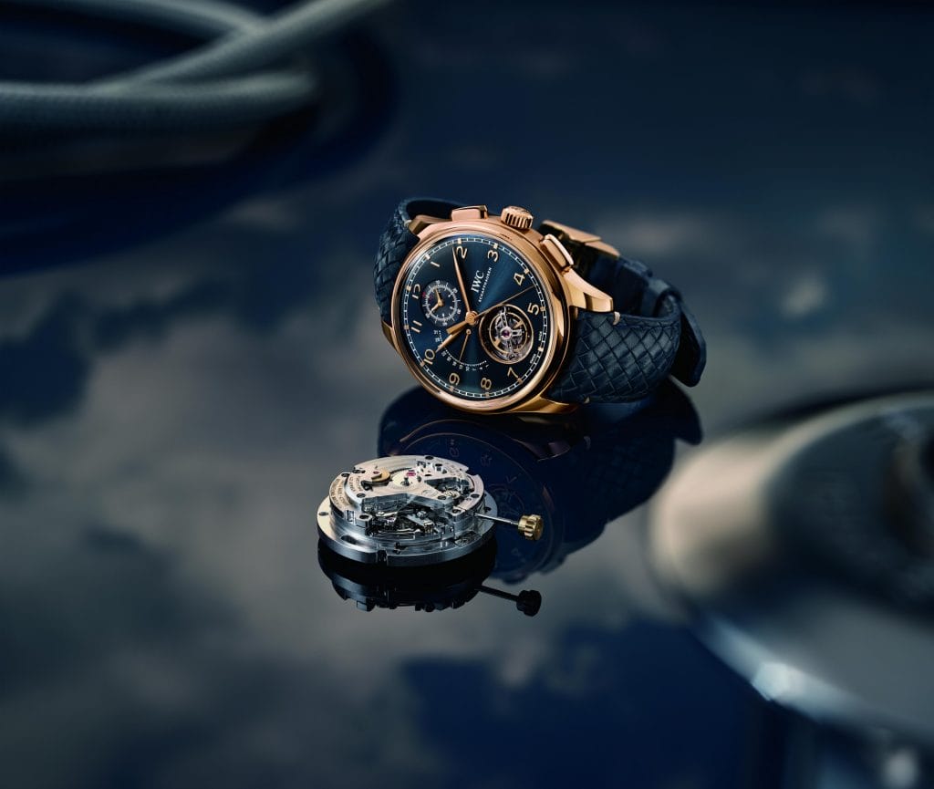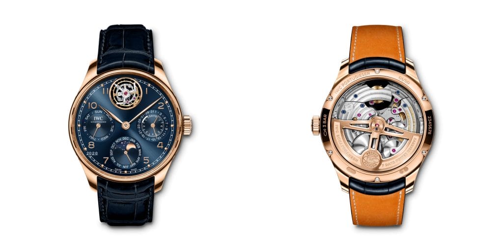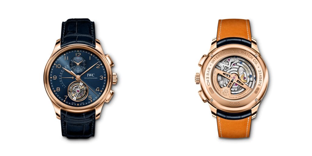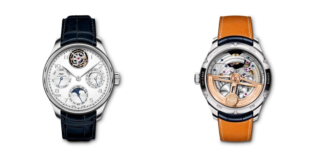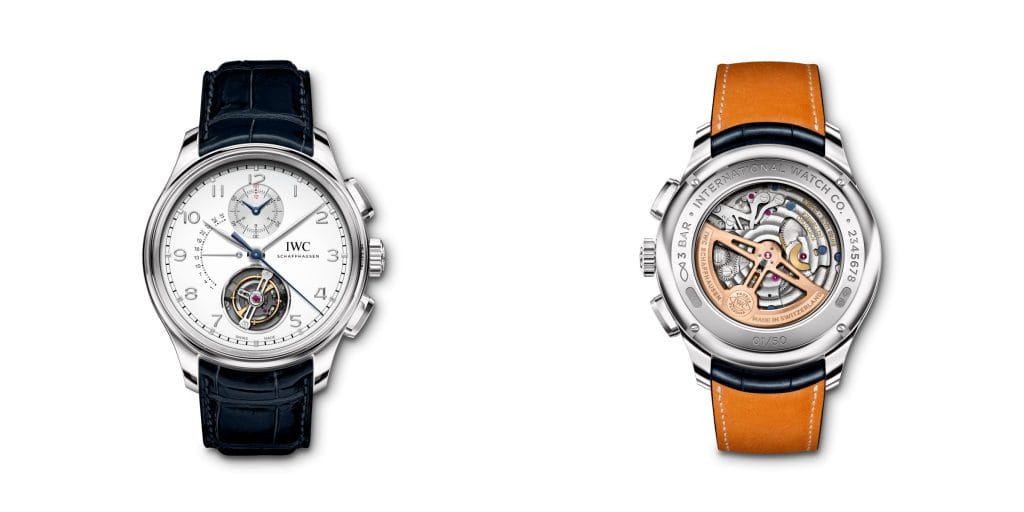 IWC Schaffhausen présente deux modèles Portugieser dotés de complications de Haute Horlogerie. La Portugieser Tourbillon Rétrograde Chronographe combine un tourbillon avec un affichage rétrograde de la date et un chronographe tandis que la Portugieser Calendrier Perpétuel Tourbillon arbore un tourbillon et un calendrier perpétuel.
