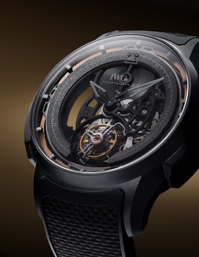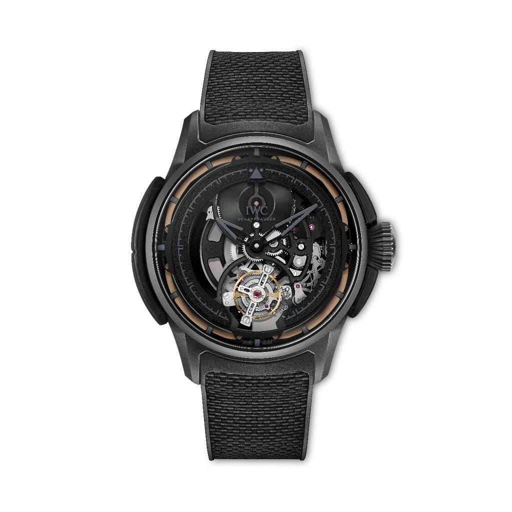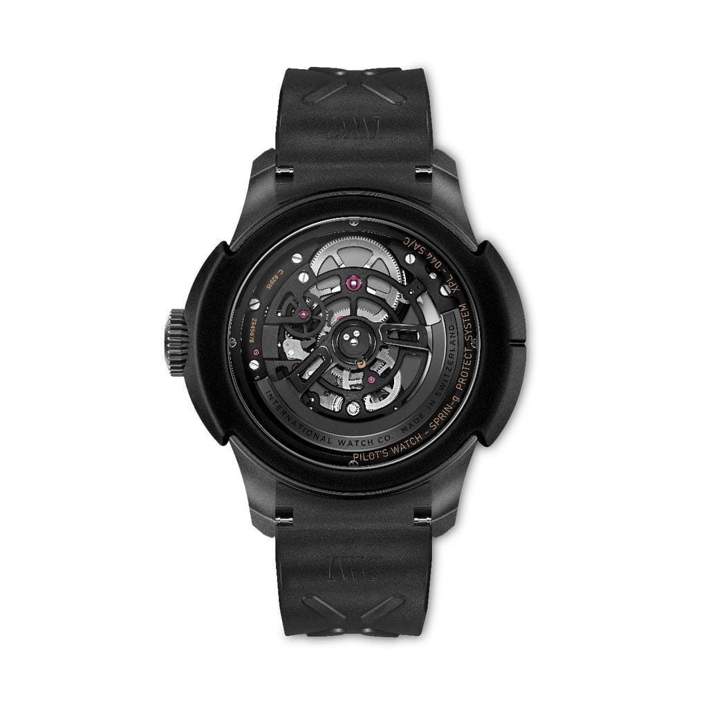 Le boîtier et la couronne sont réalisés en Ceratanium®, matériau exclusif développé par IWC. Issu d’un alliage spécial de titane, il est travaillé puis cuit dans un four à céramique, acquérant ainsi la dureté et la résistance aux rayures de la céramique tout en conservant la légèreté et la solidité du titane. Le boîtier présente également des amortisseurs en caoutchouc sur ses flancs. L’ensemble est complété par un bracelet en caoutchouc noir texturé, fermé par une boucle ardillon en Ceratanium®.