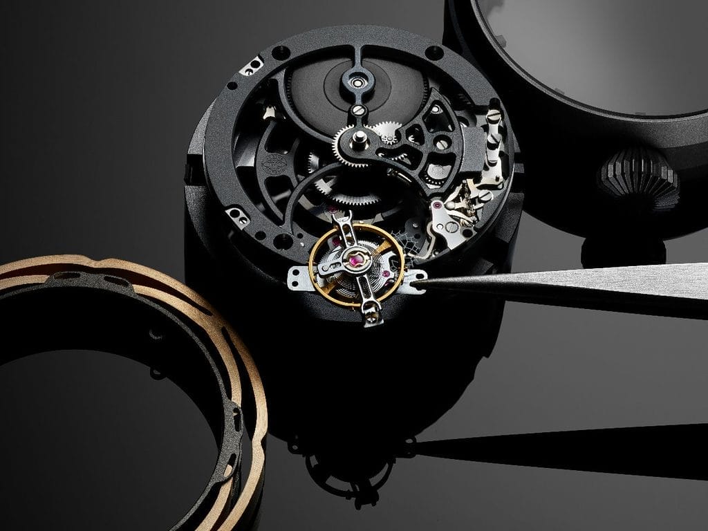 Afin d’optimiser le système, la masse du mouvement a été réduite au maximum. Les platines, les ponts et le rotor du calibre 82915 ont été évidés, tandis que le cadran se limite à un anneau noir marqué du triangle à 12 heures et d’une minuterie. Les aiguilles squelettées et recouvertes de Super-LumiNova® complètent l’ensemble. Le tourbillon minutes volant, composé de 56 éléments pour seulement 0,663 gramme, est placé à 6 heures. Le mouvement est doté d’un système de remontage Pellaton avec composants en céramique, qui exploite le moindre mouvement du rotor pour assurer une réserve de marche de 80 heures.