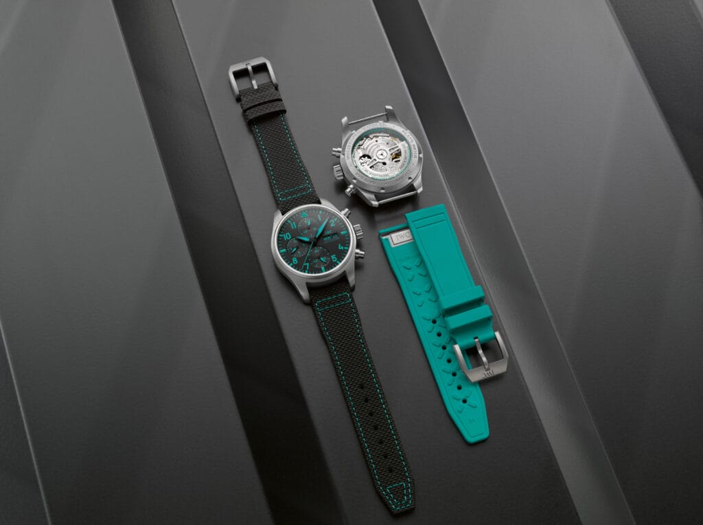 La Montre d’Aviateur Chronographe 41 Édition « Mercedes-AMG Petronas Formula One™ Team » (réf. IW388108) est réalisée en titane grade 5, un matériau léger et remarquablement rigide. En plus d’offrir le meilleur rapport résistance-densité de tous les métaux, le titane est également largement répandu dans l’ingénierie automobile. Il est utilisé pour fabriquer des pièces soumises à d’importantes sollicitations, notamment les soupapes de moteur, et résiste particulièrement bien à la corrosion. Après l’usinage et le sablage, sa surface conserve une superbe couleur grisée scintillante. Le design distinctif est complété par un cadran noir, avec des imprimés et de la matière luminescente dans la couleur verte emblématique de l’écurie. Le calibre de manufacture IWC 69385, un mouvement chronographe de conception classique avec roue à colonnes, se compose de 231 pièces distinctes et peut être admiré à travers un fond en verre saphir. Le système de remontage à cliquets bidirectionnel garantit une réserve de marche de 46 heures.