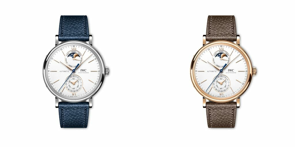 Une première version (réf. IW359002) possède un boîtier en or rouge 750/1000, un cadran argenté, des aiguilles dorées, des appliques en or massif et un bracelet en cuir de veau taupe. Le second modèle (réf. IW359001) se distingue par un boîtier en acier inoxydable, un cadran argenté, des aiguilles et appliques dorées et un bracelet en cuir de veau bleu. Les deux références sont associées à des bracelets en cuir de veau suisse traçable qui arborent une finition douce et naturelle pour un look contemporain et luxueux.
