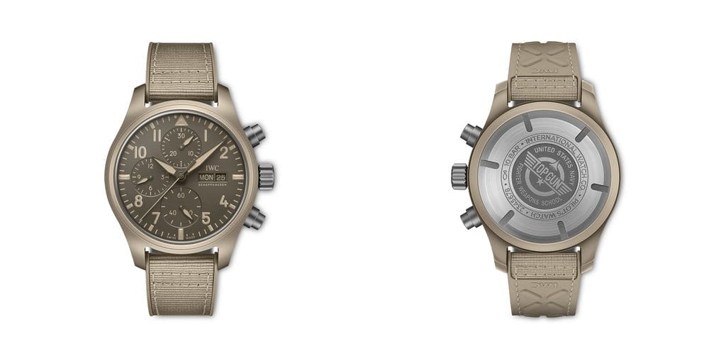 Avec la Montre d’Aviateur Chronographe 41 TOP GUN Mojave Desert (réf. IW389402), IWC enrichit son assortiment d’un troisième chronographe en céramique, d’un diamètre de 41 millimètres. Le boîtier est en céramique couleur sable. Baptisée Mojave Desert, cette nuance rehaussée de notes beiges et kaki est inspirée des combinaisons de vol des pilotes de l’aéronavale ainsi que des paysages désertiques qui entourent China Lake – la base où est implantée la célèbre école TOPGUN de l’U.S. Navy. Le cadran brun foncé, les aiguilles, les imprimés, la matière luminescente de même que le bracelet en caoutchouc avec insert en textile sont parfaitement assortis au boîtier. La couronne, les poussoirs du chronographe et le fond du boîtier sont en titane gris mat.
