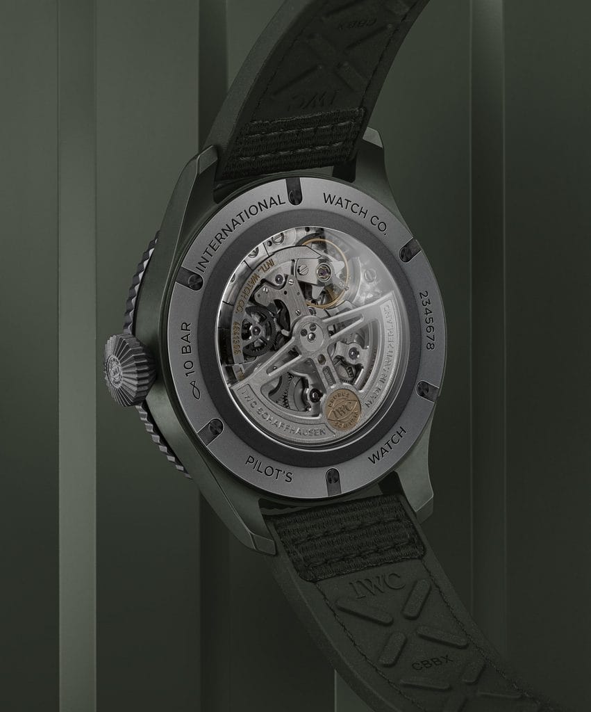 Grâce à la fonction intégrée Timezoner®, la montre peut être réglée sur un fuseau horaire différent d’une simple pression suivie d’une rotation de la lunette. L’aiguille des heures, l’affichage des 24 heures et la date avancent ou reculent par palier d’une heure. Ce réglage fonctionne également lorsque la ligne de changement de date est franchie – sans perdre une seule seconde au cours du processus. L’anneau des villes est en céramique verte tandis que sa lunette extérieure est en Ceratanium®. Cet anneau affiche le nom de 24 métropoles, chacune représentant l’un des fuseaux horaires internationaux. Le garde-temps est entraîné par le calibre 82760 de manufacture IWC. Ce mouvement automatique possède un système de remontage Pellaton doté de composants en céramique et garant d’une réserve de marche de 60 heures. Le mouvement est visible à travers un fond teinté en verre saphir.