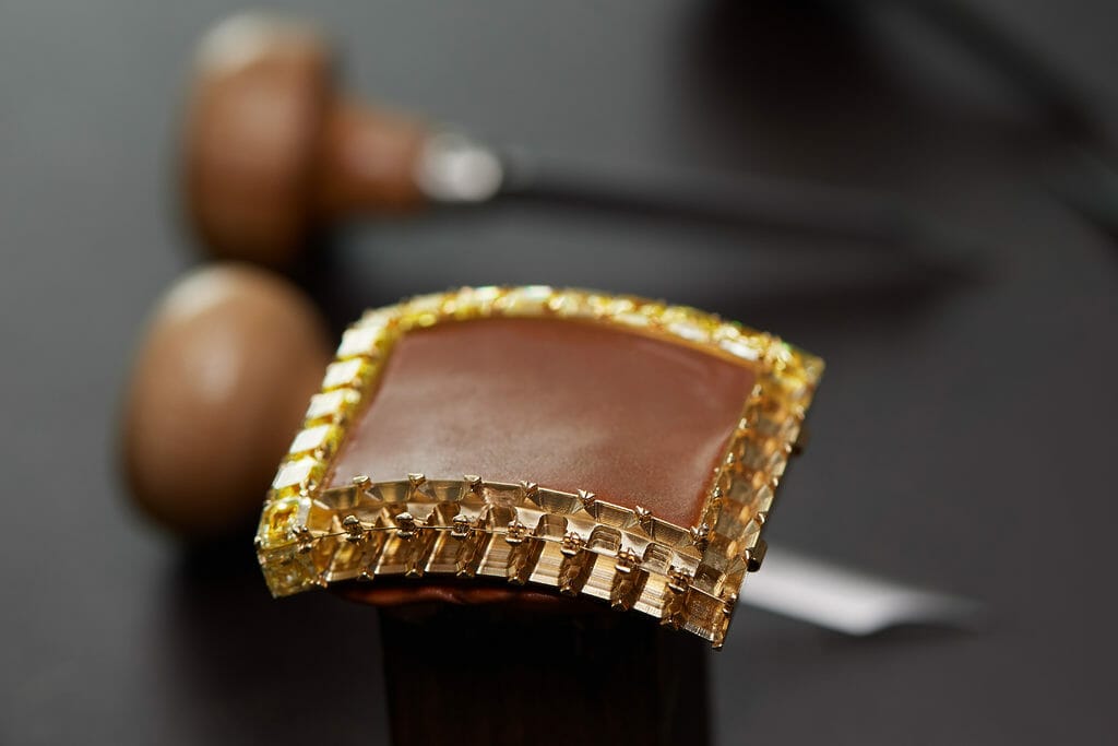La Billionaire Timeless Treasure est une mosaïque où chaque diamant jaune a un rôle bien défini : une taille précise, une fonction spécifique. Il ne s’agit pas de brillants interchangeables sur une lunette. La Billionaire Timeless Treasure est une composition artistique. Comme pour toute composition, la trame sous-jacente est primordiale, même si elle n’est pas toujours évidente. C’est le cas de la structure en or jaune qui soutient les pierres précieuses de la montre. Ce treillis extrêmement complexe est fabriqué sur mesure, maillon par maillon, goupille par goupille, et ajusté avec précision pour chaque pierre précieuse qu’il est destiné à contenir.