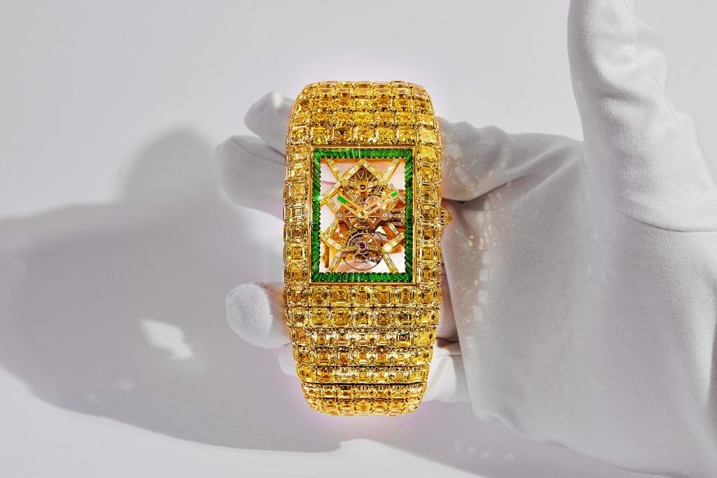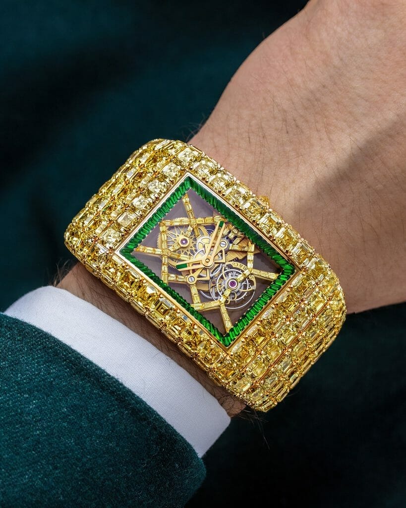 A l’origine, 880 carats de diamants jaunes bruts qui sont devenus, après des milliers d’heures de taille selon l’exigeante coupe Asscher, un total de 216,89 carats. Ces 425 pierres sont disposées individuellement comme une mosaïque miniature, et pourtant d’une ampleur sans précédent. Leurs couleurs Fancy Yellow et Fancy Intense Yellow sont rehaussées par l’éclat unique des tsavorites vertes. 57 autres diamants baguettes jaunes complètent le mouvement tourbillon squelette de la Billionaire.
