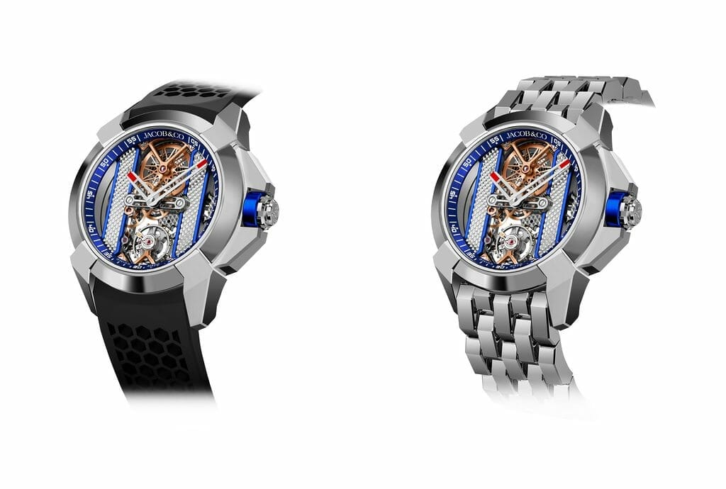 La première Epic X a donné lieu à une multitude de variations, que ce soit en termes de design et de mouvements mécaniques. C’est justement la conception de la montre qui permet toutes ces interprétations de matériaux, de couleurs et de sertissages. Ainsi, Jacob&Co. propose trois versions différentes, qui témoignent de cette polyvalence : boîtier en acier avec pièces en aluminium bleu sur bracelet en acier ou en caoutchouc noir, boîtier en or rose avec pièces en aluminium vert sur bracelet en or rose ou en caoutchouc noir, et boîtier en DLC noir avec détails noirs sur bracelet en caoutchouc.