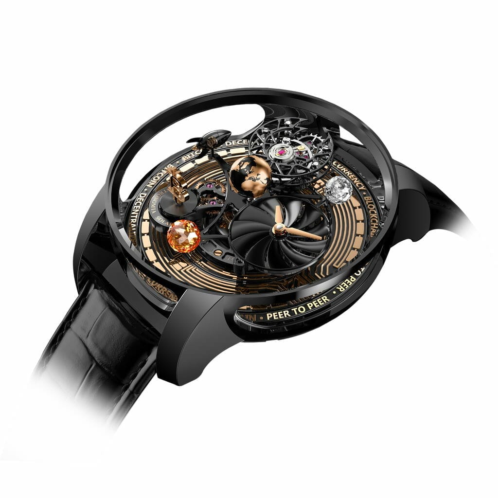 C’est une montre qui s’inscrit dans son temps, celui de l’aube de l’ère du Bitcoin et autres crypto-monnaies. A l’occasion des Geneva Watch days 2022, Jacob&Co. présente un extraordinaire garde-temps, par son esthétique et son mouvement à complications. D’un diamètre imposant de 44 mm, fait de titane DLC noir, l’Astronomia Solar Bitcoin est un hommage symbolique et horloger au monde des crypto-monnaies.