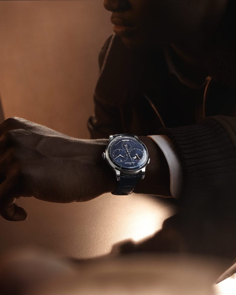 Soulignant la précision du calibre, on note par ailleurs un élément distinctif du cadran du Duometre Quantieme Lunaire, qui tourne en continu dans un compteur à 6 heures : l’aiguille de la seconde foudroyante. En effectuant une révolution complète en une seconde avec six « sauts » par tour (contrairement à une trotteuse classique qui effectue un tour de cadran en 60 secondes), la foudroyante permet de calculer des temps précis au sixième de seconde.