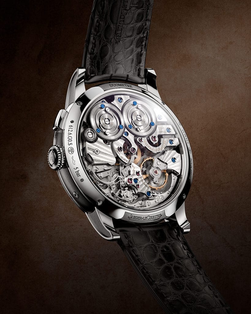 Ce premier calibre a néanmoins constitué le point de départ du développement du concept Duomètre pour les ingénieurs et horlogers de Jaeger-LeCoultre du XXIe siècle. En dédoublant le couple barillet/train d’engrenage – un pour l’affichage horaire et un autre pour la ou les complication(s), tous deux reliés à un seul et même échappement – le système Duometre garantit une transmission d’énergie parfaitement constante, que la complication soit activée ou non.