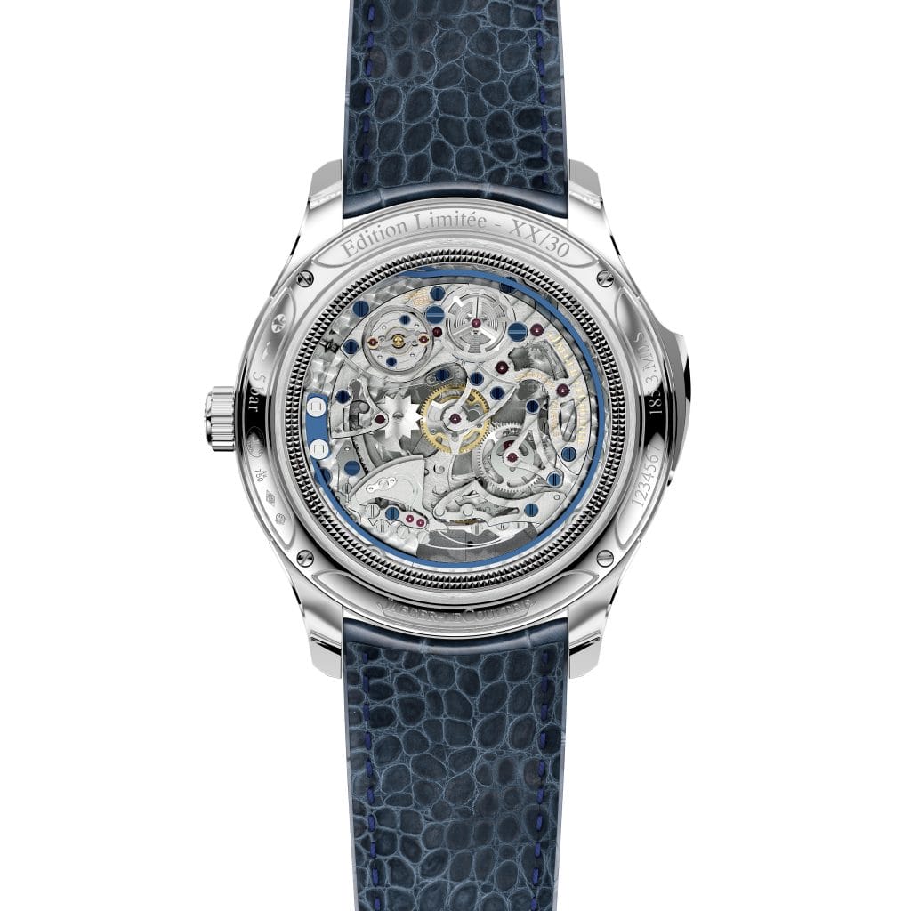 Un même travail de haute précision est à l’origine de la nouvelle édition limitée que la Manufacture a l’honneur de vous présenter en avant-première, la Master Grande Tradition Répétition Minutes Perpétuelle. S’inspirant des codes esthétiques de l’illustre collection Master Grande Tradition, ce nouvel opus confirme l’expertise de Jaeger-LeCoultre dans le domaine des montres à sonnerie, grâce à un système de timbres totalement inédit conçu pour reproduire la mélodie des anciennes montres de poche avec une extraordinaire qualité acoustique, rarement atteinte dans des montres à grandes complications. Dans son boîtier en or gris (13,72 mm) d’une grande élégance et ergonomie, cette pièce exceptionnelle marque une nouvelle étape dans l’histoire horlogère, que ce soit en termes d’innovation mécanique ou d’arts décoratifs miniatures. Un seul coup d’œil sur les deux versions de cadrans de la montre – l’un grené argenté, l’autre guilloché à la main, revêtu d’un émail bleu translucide – suffit à le démontrer.
