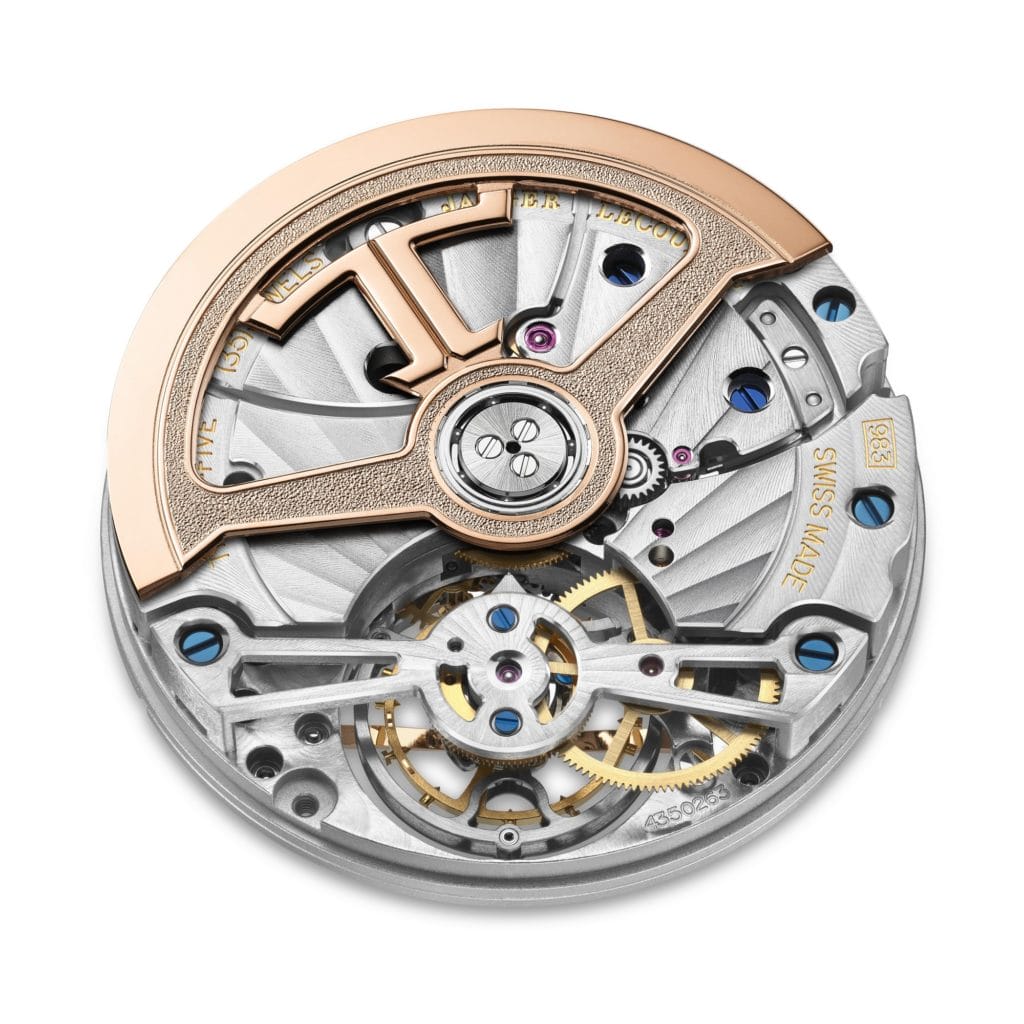 Sur l’envers, la longueur du pont de tourbillon ajouré assure encore plus de transparence, tandis que son motif Côtes de Genève complète les rayons du motif soleillé de la platine principale. Ornée du logo JL et d’une combinaison de surfaces polies et microbillées, la masse oscillante ajourée en or rose offre une vue dégagée sur le mouvement et la finesse des finitions : vis bleues, perlage et ponts chanfreinés.