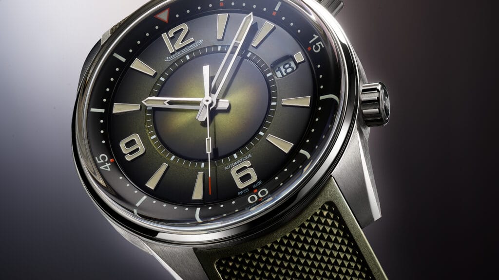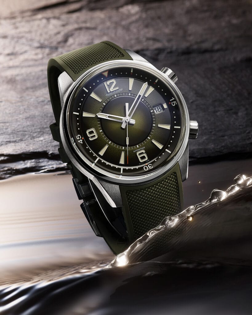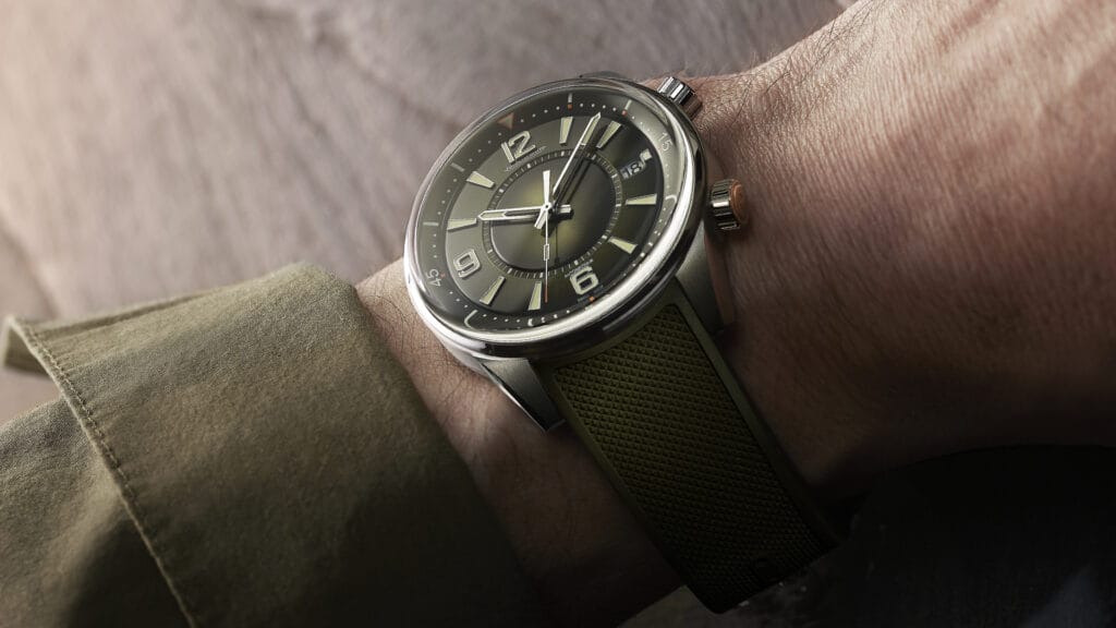Pour une polyvalence maximale, la Polaris Date se porte avec un bracelet en caoutchouc vert équipé d’un système de changement rapide. Il suffit de quelques secondes pour remplacer ce bracelet par l’un des nombreux modèles Jaeger-LeCoultre parfaitement compatibles.