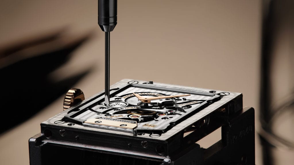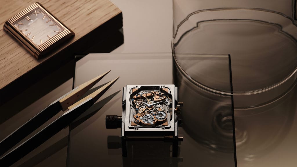 Dans les années 1990, en pleine renaissance de l’horlogerie mécanique faisant suite à la crise du quartz, la Reverso et son boîtier rectangulaire si particulier sont devenus le support privilégié permettant à la Manufacture de redévelopper son expertise des grandes complications. Après avoir maîtrisé les mouvements rectangulaires, véritable contrainte supplémentaire puisqu’ils imposent une architecture entièrement différente de celle des mouvements ronds traditionnels et représentent un défi particulièrement exigeant pour les mécanismes de carillon – Jaeger-LeCoultre a présenté la Reverso Répétition Minutes en 1994. C’était le premier mouvement à répétition minutes rectangulaire au monde et la première fois que la Maison miniaturisait une répétition minutes pour une montre-bracelet.