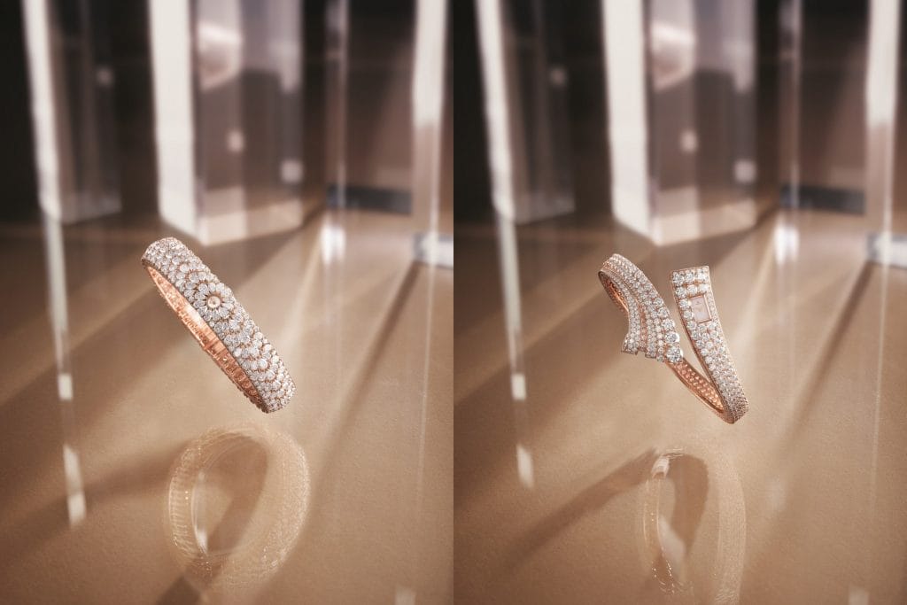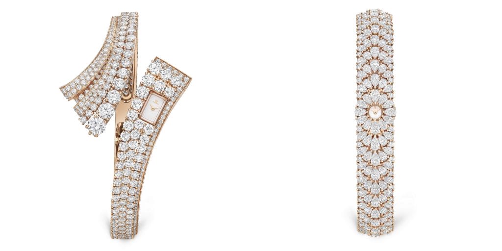 Les deux bracelets adhèrent fidèlement aux codes classiques de la Haute Joaillerie : façonnés en or rose, ils sont sertis de diamants de pureté IF à VVS. Ils sont toutefois très différents l’un de l’autre, tant par leur forme et leur personnalité, soulignant la liberté créative permise par le petit Calibre 101.