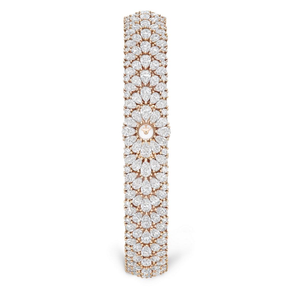 Avec 904 pierres, dont 204 de forme poire et le reste de taille brillant (pour un total de 20,9 carats), le sertissage à lui seul nécessite 130 heures de travail par les artisans joailliers de la Manufacture Jaeger-LeCoultre. De profil, on observe que la structure du bracelet est soutenue par deux anneaux d’or, chacun incrusté de diamants en serti grain, une technique de sertissage linéaire dans laquelle de petites billes d’or sont repoussées depuis la surface du métal par-dessus la pierre pour la maintenir en place.