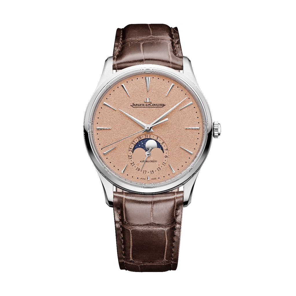 Les nouveaux cadrans grainés apportent une identité originale et contemporaine aux modèles Master Ultra Thin Date et Master Ultra Thin Moon. Leur texture délicate joue avec la lumière et révèle des nuances oscillant entre douceur poudrée et tonalités plus soutenues. Ces couleurs chaleureuses contrastent nettement avec le boîtier en acier poli, les index allongés et les aiguilles facettées. La composition du cadran, inspirée par la sobriété du boîtier de 39 mm, a été pensée selon un équilibre précis, structuré autour du guichet de date ou de la phase de lune positionné à 6 heures. Les index trapézoïdaux allongés répondent aux aiguilles Dauphine, partagées entre satinage et polissage pour créer un jeu lumineux captivant. Le bracelet en alligator, proposé dans une nouvelle teinte brune et équipé d’une boucle déployante en acier inoxydable interchangeable, ajoute polyvalence et modernité.