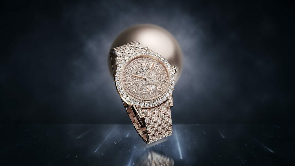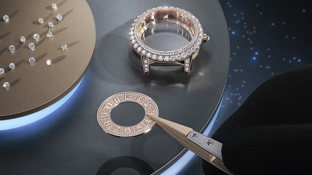 Pour la toute première fois, la ligne Rendez-Vous Dazzling se dote d’un cadran entièrement serti de diamants. Sur cette nouvelle interprétation, les diamants serti-grains en cercles concentriques diffusent leur lumière du centre du cadran vers l’extérieur. Le motif géométrique, formé par des centaines de diamants tenus par de fines griffes en or, si petites qu’elles en sont presque invisibles à l’œil nu, est la preuve incontestable du savoir-faire et de la précision des sertisseurs de l’atelier des Métiers Rares™. La boîte et le cadran comptent en effet 590 diamants, nécessitant 58 heures de travail méticuleux. Une prouesse joaillère.