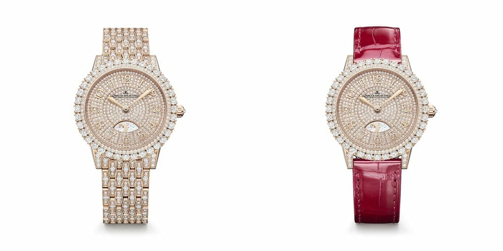Deux nouvelles expressions de la Rendez‑Vous Dazzling Night & Day s’invitent dans la collection féminine de Jaeger‑LeCoultre : éblouissantes par leur cadran entièrement serti de diamants, l’une d’entre-elle est proposée sur un bracelet en cuir d’alligator rouge éclatant alors que l’autre arbore un bracelet en or rose entièrement serti de diamants.